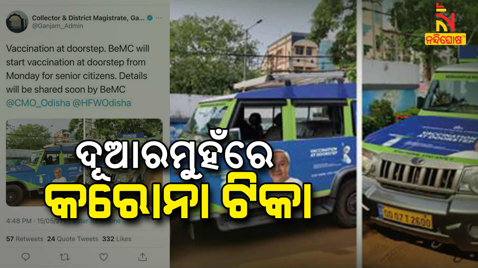 ଗଞ୍ଜାମ: ବିକାଶ ଦୂଆର ମୁହଁରେ ପହଁଚିବ ଟିକା ବହ୍ମପୁର ମହାନଗର ନିଗମ ଦେଲା ସୂଚନା । ଘରେ ଘରେ ହେବ ଟିକାକରଣ । ବ୍ରହ୍ମପୁର ମହାନଗର ନିଗମ ତରଫରୁ ନିଆଯାଇଛି ଏହି ସ୍ୱତନ୍ତ୍ର ପଦକ୍ଷେପ । ବ୍ରହ୍ମପୁରର ବରିଷ୍ଠ ନାଗରିକ ଓ ଦିବ୍ୟାଙ୍ଗ ମାନଙ୍କ ପାଇଁ ସହଜରେ ଘରେ ଉପଲବ୍ଧ ହେବ ଟିକା । ସେଥିପାଇଁ ସ୍ୱତନ୍ତ୍ର ଗାଡିର ବ୍ୟବସ୍ଥା କରାଯାଇଛି । ସୂଚନା ଦେଲେ ଗଞାମ ଜିଲ୍ଲାପାଳ ବିଜୟ ଅମୃତା କୁଲାଙ୍ଗେ ।