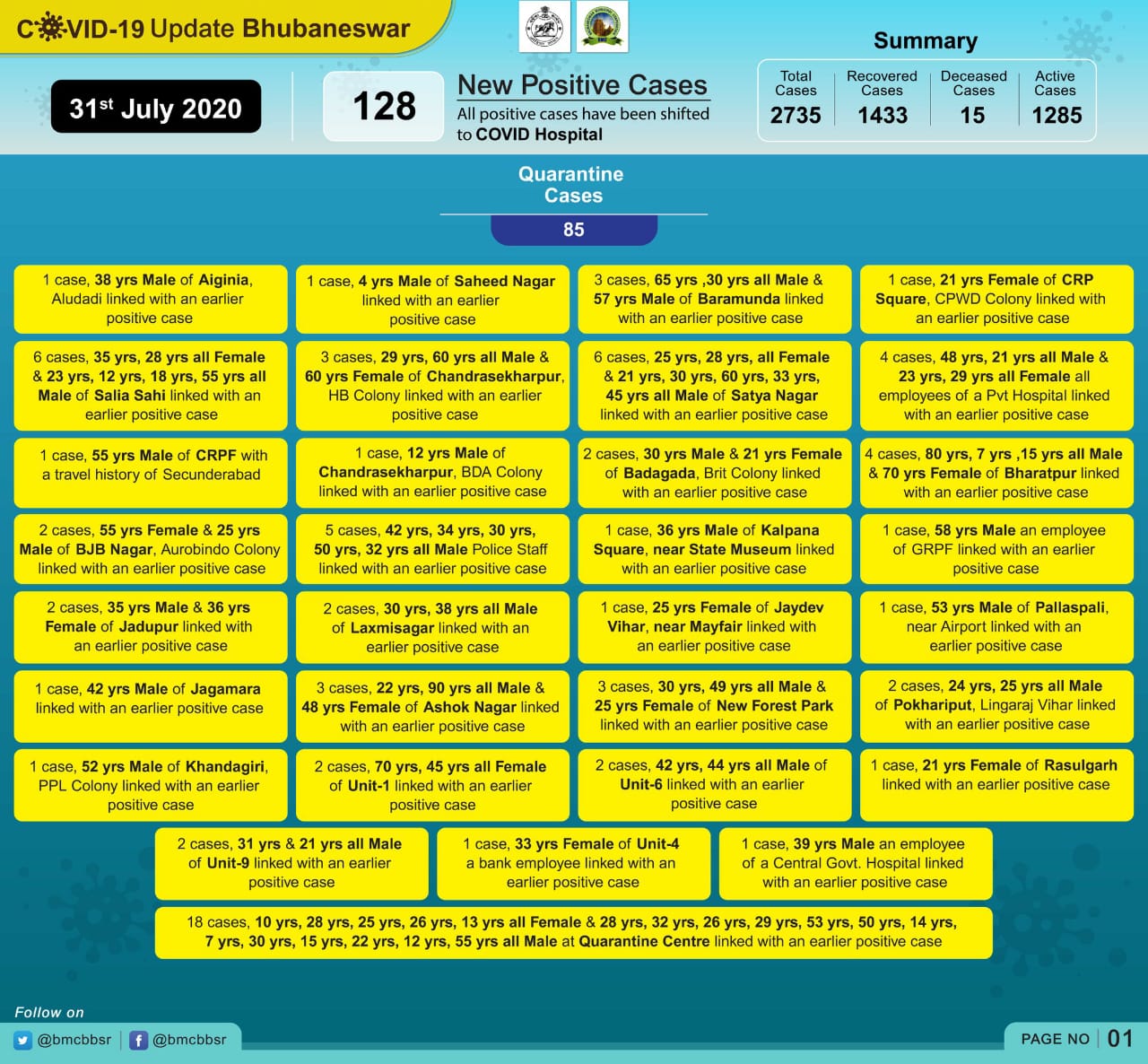 ସେପଟେ ରାଜ୍ୟରେ ଆଉ ୧୪୯୯ ଜଣ କରୋନା ପଜିଟିଭ୍ ଚିହ୍ନଟ ହୋଇଛନ୍ତି । କ୍ୱାରେଣ୍ଟାଇନରୁ ୯୧୪ଟି ଓ ଲୋକାଲ୍ କେସ୍ ୫୮୫ଟି ରହିଛି । ରାଜ୍ୟରେ ମୋଟ୍ କରୋନା ପଜିଟିଭ୍ ସଂଖ୍ୟା ୩୧ ହଜାର ୮୭୭କୁ ବୃଦ୍ଧି ପାଇଛି । ସେହିଭଳି ସଂକ୍ରମିତଙ୍କ ସହ ମୃତ୍ୟୁ ସଂଖ୍ୟା ମଧ୍ୟ ବଢିବାରେ ଲାଗୁଛି । ଗତକାଲି ୧୦ ଜଣର କରୋନାରେ ମୃତ୍ୟୁ ହୋଇଥିବା ବେଳେ ଆଜି ଆଉ ୮ ଜଣଙ୍କ ମୁଣ୍ଡ ନେଇଛି କରୋନା । ଏନେଇ ରାଜ୍ୟ ସ୍ୱାସ୍ଥ୍ୟ ଓ ପରିବାର କଲ୍ୟାଣ ବିଭାଗ ସୂଚନା ଦେଇଛି ।