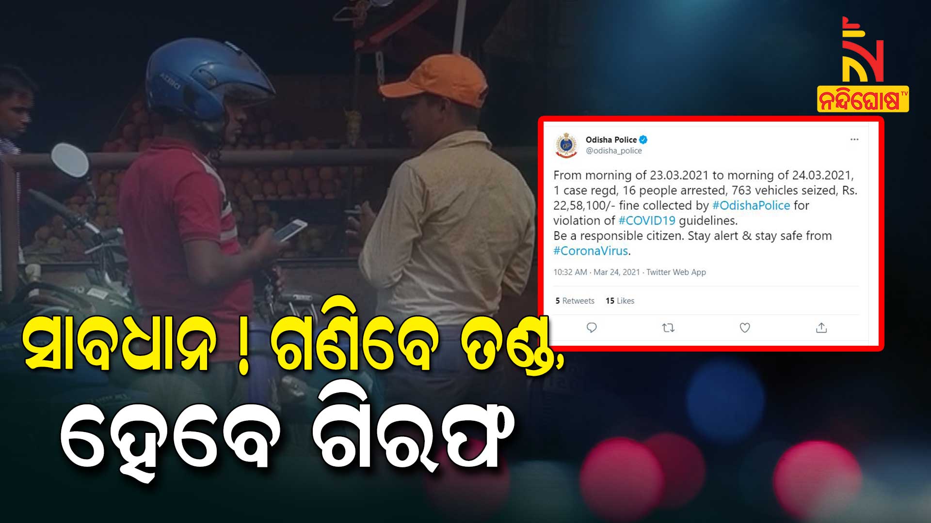 ଭୁବନେଶ୍ୱର: ରାଜ୍ୟରେ କରୋନା ଆକ୍ରାନ୍ତଙ୍କ ସଂଖ୍ୟା ବୃଦ୍ଧି ପାଉଥିବାରୁ ରାଜ୍ୟ ସରକାର ସାମାଜିକ ଦୂରତା ନିୟମକୁ କଡ଼ାକଡ଼ି କରିଛନ୍ତି । ପୋଲିସ ପ୍ରସାଶନ ମଧ୍ୟ କୋଭିଡ ୧୯ ଆଇନର ପାଳନ ନେଇ ବ୍ୟାପକ ଯାଞ୍ଚ ପ୍ରକ୍ରିୟା ଆରମ୍ଭ କରିଛି । ଗତକାଲିଠାରୁ ଏହି ଯାଞ୍ଚ ପ୍ରକ୍ରିୟାକୁ ଅଧିକ କଡ଼ାକଡ଼ି କରାଯାଇଛି । ଓଡ଼ିଶା ପୋଲିସ ପକ୍ଷରୁ ମିଳ୍ଥିବା ସୂଚନା ଅନୁଯାୟୀ, ୨୩ ତାରିଖ ସକାଳୁ, ୨୪ ତାରିଖ ସକାଳ ମଧ୍ୟରେ କୋଭିଡ ଆଇନ ଉଲଙ୍ଘନ ନେଇ ହୋଇଥିବା ଗୋଟିଏ ମାମଲା ରୁଜୁ ହୋଇଥିବାବେଳେ ୧୬ ଜଣଙ୍କୁ ଗିରଫ କରାଯାଇଛି ଓ ୭୬୩ଟି ଗାଡ଼ି ଜବତ କରାଯାଇଛି । ସେହିଭଳି ୨୨,୫୮,୧୦୦( ୨୨ ଲକ୍ଷ ୫୮ ହଜାର ୧୦୦ ଟଙ୍କା) ଜରିମାନା ଆଦାୟ କରାଯାଇଛି ।