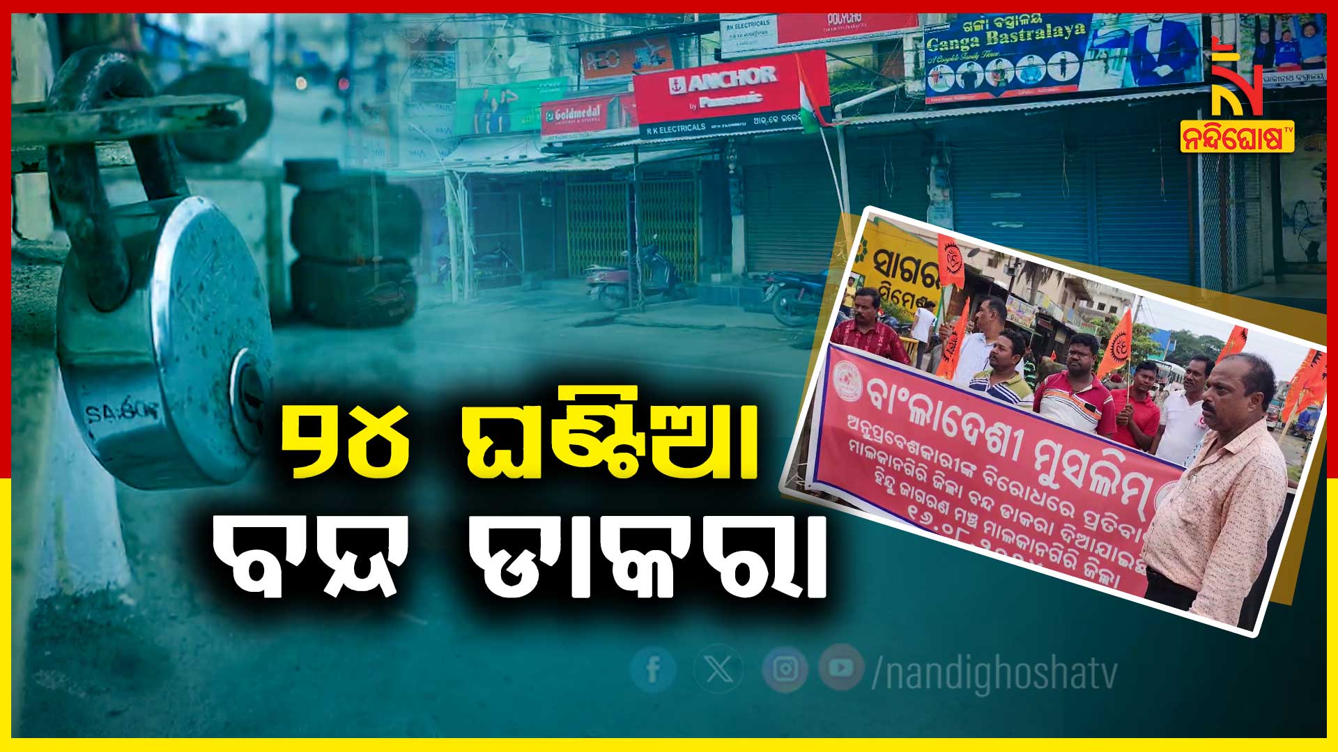 ମାଲକାନଗିରି : ୨୪ ଘଣ୍ଟିଆ ମାଲକାନଗିରି ବନ୍ଦ ଡାକରା। ହିନ୍ଦୁ ଜାଗରଣ ମଞ୍ଚ ପକ୍ଷରୁ ବନ୍ଦ ଡାକରା ଦିଆଯାଇଛି। ବାଂଲାଦେଶରେ ହିନ୍ଦୁଙ୍କ ଉପରେ ହୋଇଥିବା ଅତ୍ୟାଚାର ବିରୋଧରେ ବନ୍ଦ ଡାକରା ଦିଆଯାଇଛି। ମାଲକାନଗିରି ଜିଲ୍ଲାରେ ମଧ୍ୟ ବେଆଇନ ଅନୁପ୍ରବେଶକାରୀଙ୍କୁ ଚିହ୍ନଟ କରି କାର୍ଯ୍ୟାନୁଷ୍ଠାନ ନେବାକୁ ଦାବି ହୋଇଛି। ଯାନବାହାନ ଚଳାଚଳ ତଥା ଦୋକାନ ବଜାର ସମୁର୍ଣ୍ ଭାବେ ବନ୍ଦ ରହିଛି। ଆଇନ କାନୁନ ବଜାୟ ରଖିବା ପାଇଁ ବିଭିନ୍ନ ସ୍ଥାନରେ ପୋଲିସ ମୁତୟନ କରାଯାଇଛି। ସହରର ବିଭିନ୍ନ ଛକରେ ବନ୍ଦ ପାଳନ କରାଯାଇଛି। ସକାଳ ୬ଟାରୁ ଆସନ୍ତାକାଲି ସକାଳ ୬ଟା ପର୍ଯ୍ୟନ୍ତ ଜିଲ୍ଲାରେ ଯାନବାହନ ଚଳାଚଳ ବନ୍ଦ ରହିବା ସହ ଦୋକାନ ବଜାର ସ୍କୁଲ କଲେଜ ମଧ୍ୟ ବନ୍ଦ ରହିବ। କେବଳ ଜରୁରୀ କାଳୀନ ସେବା ଗୁଡିକ ଚାଲୁ ରହିଥିବା ବେଳେ ଅନ୍ୟ ଯାତାୟାତ ବନ୍ଦ୍ ରହିଛି।