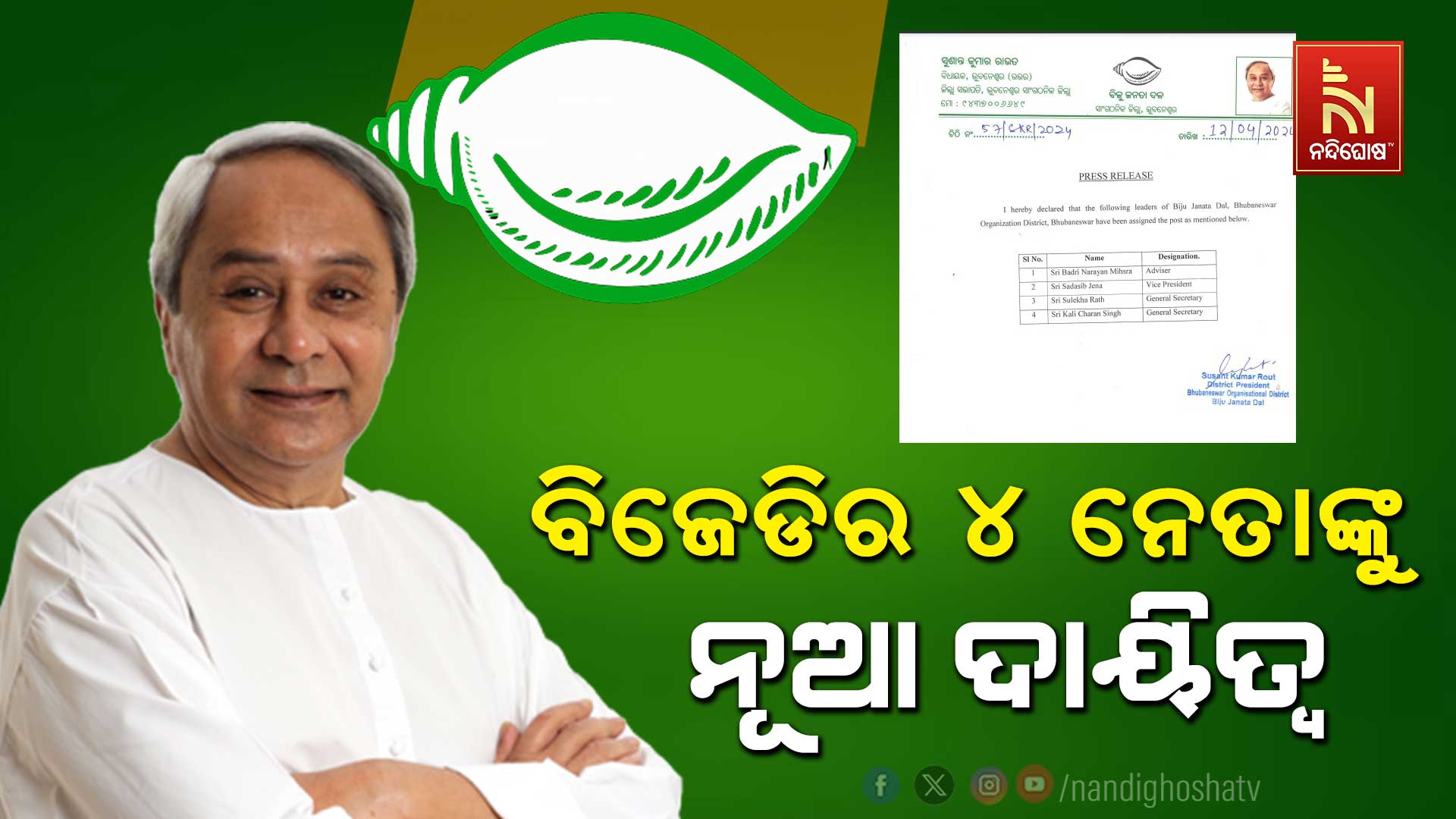 ଭୁବନେଶ୍ୱର: ବିଜୁ ଜନତା ଦଳରେ ୪ ନେତାଙ୍କୁ ନୂଆ ଦାୟିତ୍ଵ ଦିଆଯାଇଛି। ବିଜେଡିର ଭୁବନେଶ୍ଵର ସାଂଗଠନିକ ଜିଲ୍ଲାରେ ୪ ନେତାଙ୍କୁ ପ୍ରଦାନ କରାଯାଇଛି ନୂଆ ଦାୟିତ୍ଵ। ବଦ୍ରି ନାରାୟଣ ମିଶ୍ର ପରାମର୍ଶଦାତା ଭାବେ ନିଯୁକ୍ତ ହୋଇଛନ୍ତି। ସଦାଶିବ ଜେନା ଉପସଭାପତି ଭାବେ ନିଯୁକ୍ତ ହୋଇଛନ୍ତି। ସୁଲେଖା ରଥ ବିଜେଡି ଭୁବନେଶ୍ଵର ସାଂଗଠନିକ ଜିଲ୍ଲାର ସାଧାରଣ ସମ୍ପାଦକ ଭାବେ ନିଯୁକ୍ତ ହୋଇଛନ୍ତି।