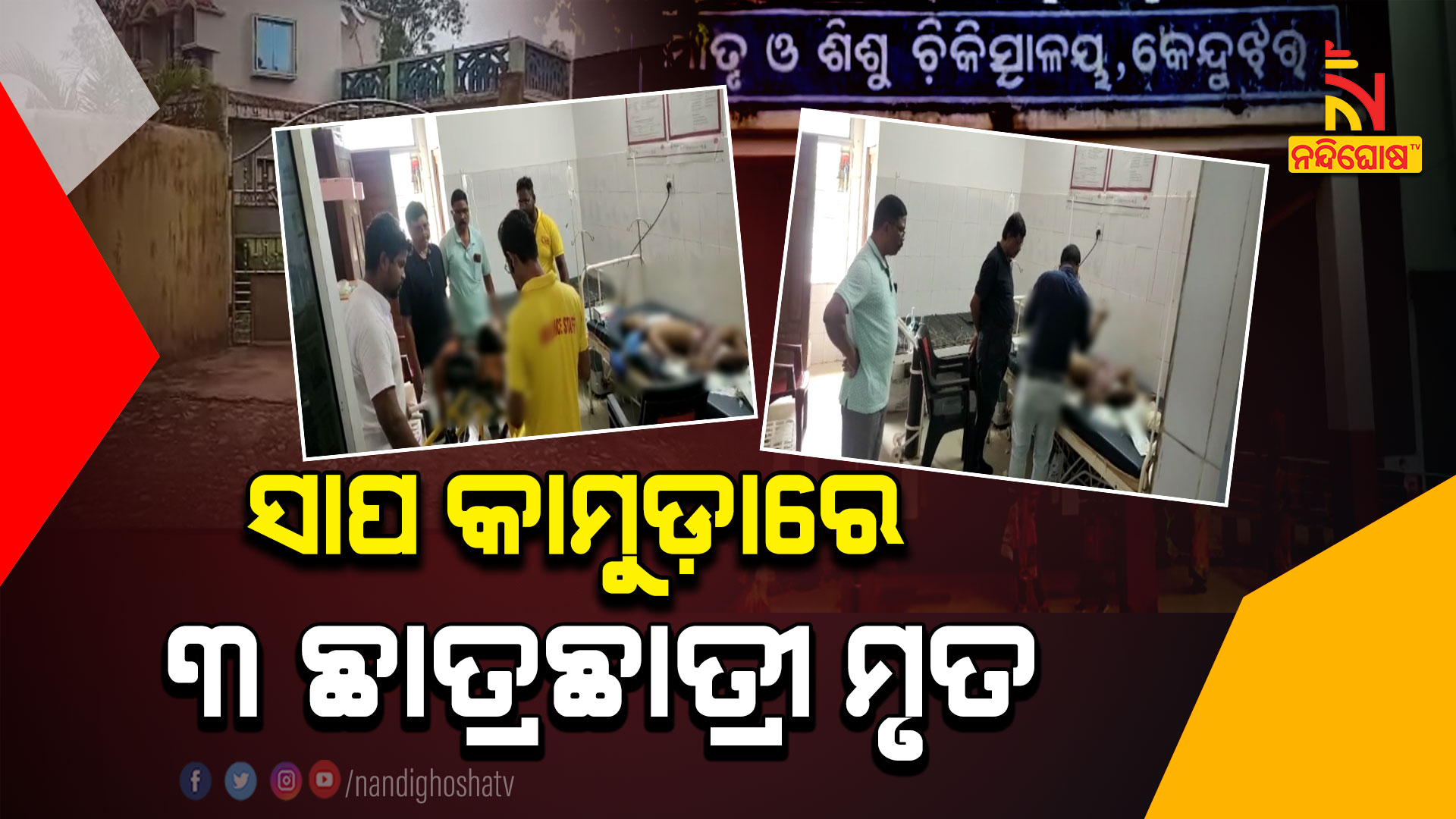 କେନ୍ଦୁଝର: କେନ୍ଦୁଝର ଜିଲ୍ଲା ବାରିଆ ଥାନା ନିଶ୍ଚିତପୁରରେ ଅଘଟଣ । କୋଚିଂ ସେଣ୍ଟରରେ ଶୋଇଥିବା ବେଳେ ବିଷାକ୍ତ ସାପ କାମୁଡ଼ାରେ ୩ ଜଣଙ୍କ ପିଲାଙ୍କ ମୃତ ହୋଇଛି । ଜଣେ ଗୁରୁତରକୁ କଟକ ମେଡିକାଲକୁ ସ୍ଥାନାନ୍ତର କରାଯାଇଛି । କୋଚିଂ ସେଣ୍ଟରରେ ଶୋଇଥିବା ବେଳେ ୪ ଜଣ ଛାତ୍ରଛାତ୍ରୀଙ୍କୁ ସାପ କାମୁଡିଥିଲା । ପ୍ରାଣ ହରାଇଥିବା ୩ ଜଣଙ୍କ ମଧ୍ୟରୁ ୨ ଛାତ୍ରୀ ଓ ଜଣେ ଛାତ୍ର ଥିବା ସୂଚନା ।