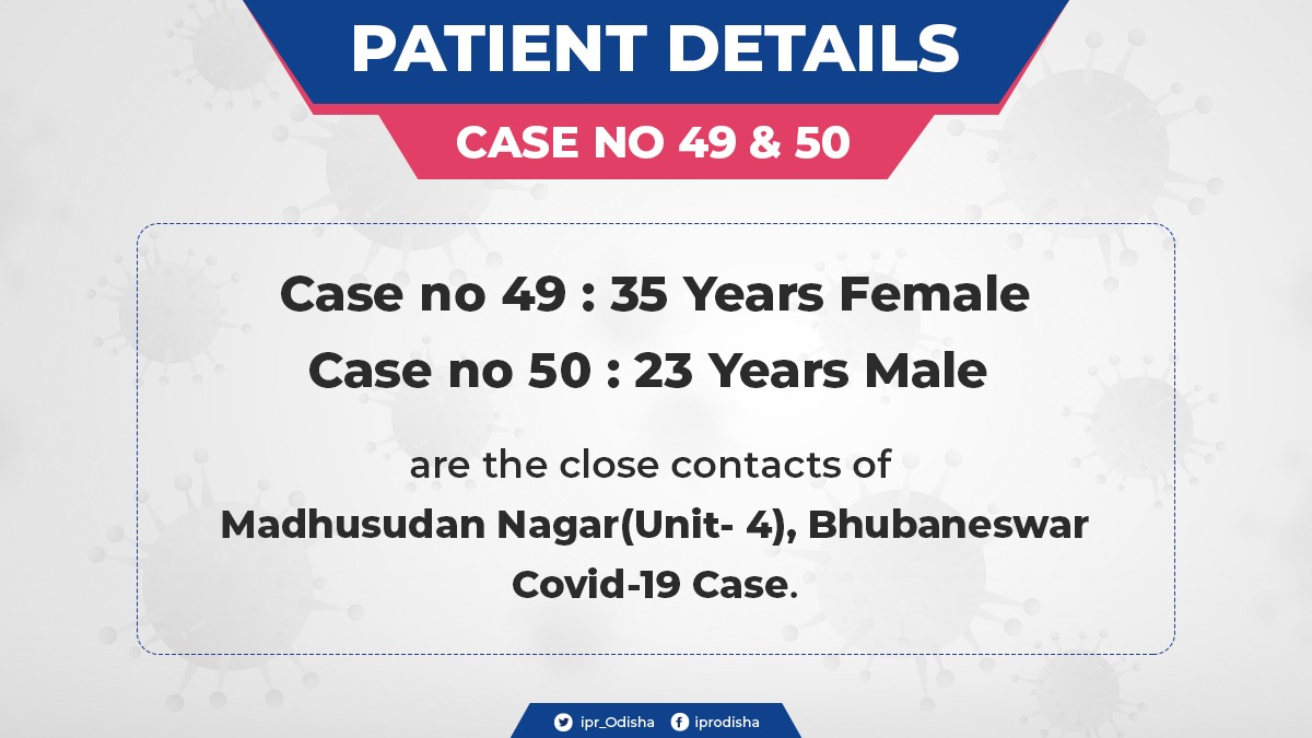 ଭୁବନେଶ୍ୱର: ରାଜ୍ୟର ୪୯ ଓ ୫୦ ନମ୍ବର କରୋନା ସଂକ୍ରମିତଙ୍କ ତଥ୍ୟ ଦେଲା ସୂଚନା ଓ ଲୋକ ସମ୍ପର୍କ ବିଭାଗ । ୨ ଆକ୍ରାନ୍ତ ୟୁନିଟ୍-୪ ମଧୁସୂଦନ ନଗରର ୪୧ ନମ୍ବର ଆକ୍ରାନ୍ତଙ୍କ ସମ୍ପର୍କୀୟ । ୩୫ ବର୍ଷୀୟ ମହିଳା ୪୯ ନମ୍ବର ଆକ୍ରାନ୍ତ ହୋଇଥିବା ବେଳେ ୨୩ ବର୍ଷର ପୁରୁଷ ହେଉଛନ୍ତି ୫୦ ନମ୍ବର ଆକ୍ରାନ୍ତ । ଗତକାଲି ଉଭୟ ଆକ୍ରାନ୍ତଙ୍କ ରିପୋର୍ଟ ପଜିଟିଭ୍ ଆସିଥିଲା । ୪୧ ନମ୍ବର କରୋନା ଆକ୍ରାନ୍ତ ଏପ୍ରିଲ ୭ ତାରିଖ ଦିନ ଚିହ୍ନଟ ହୋଇଥିଲେ । ତାଙ୍କ ବୟସ ୪୫ ବର୍ଷ ।