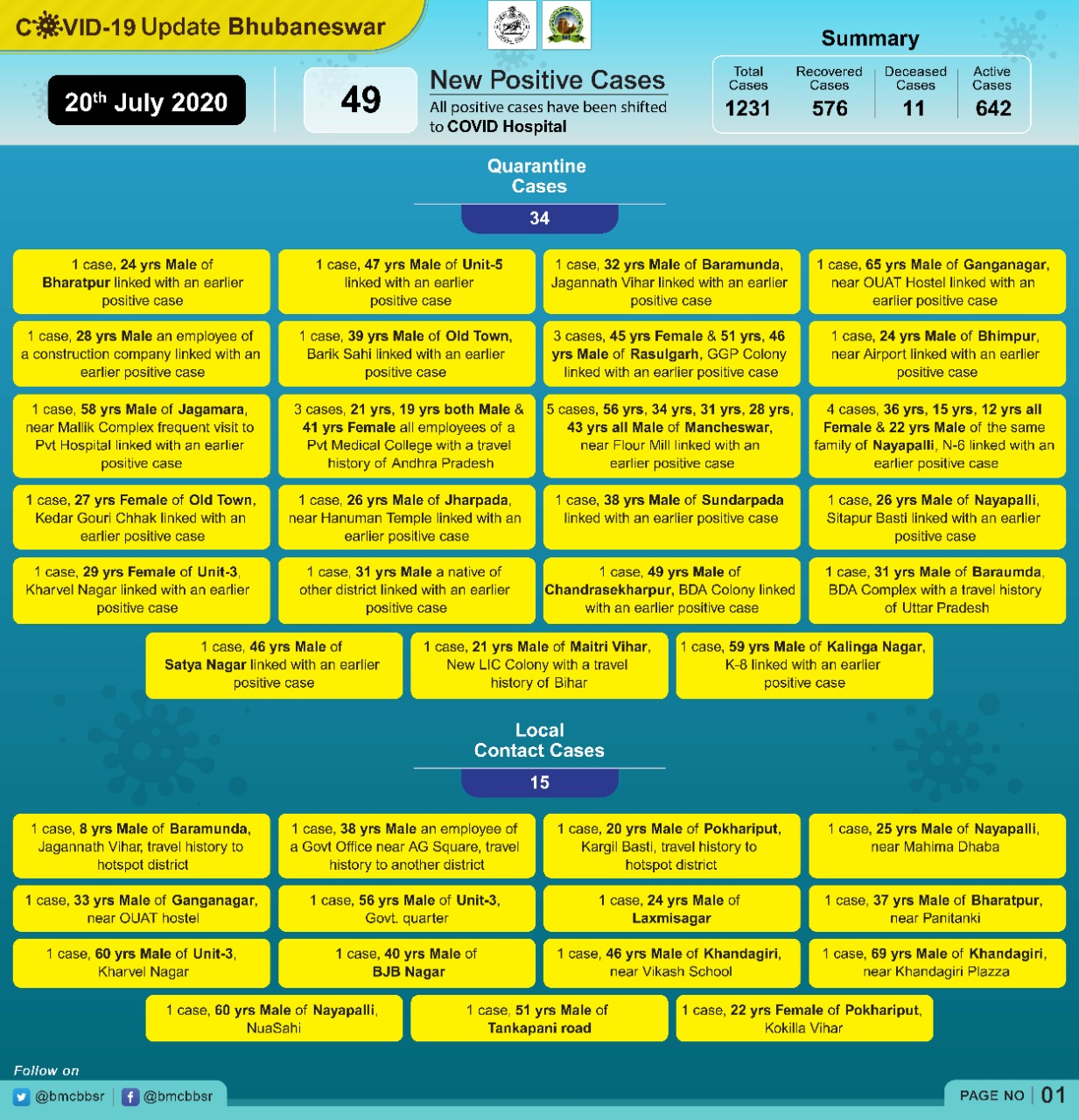 ୧୫ ଜଣ ଲୋକାଲ କଣ୍ଟାକ୍ଟ ଚିହ୍ନଟ ହୋଇଥିବା ବ୍ୟକ୍ତି ହେଉଛନ୍ତି ବରମୁଣ୍ଡା ଜଗନ୍ନାଥ ନଗରରୁ ୧, ଗଙ୍ଗନଗର OUAT ହଷ୍ଟେଲ ପାଖରୁ ୧, ୟୁନିଟ ୩ରୁ ୧, ଏଜି ଛକ ପାଖରୁ ଜଣ ସରକାରୀ କର୍ମଚାରୀ ଚିହ୍ନଟ ହୋଇଛନ୍ତି । ସେହିଭଳି ୟୁନିଟ ୩ରୁ ୧, ବିଜେବି ନଗରରୁ ୧, ପୋଖରୀପୁଟର କାରଗିଲ ବସ୍ତିରୁ ୧, ଲକ୍ଷ୍ମୀସାଗରରୁ ୧, ଖଣ୍ଟଗିରିରୁ ୧, ନୟାପଲି ମହିମାଢ଼ାବା ପାଖରୁ ୧, ଭରତପୁରରୁ ୧, ଖଣ୍ଡଗିରି ପ୍ଲାଜା ପ୍ଲାଜା ପାଖରୁ ୧, ନୟାପଲି ନୂଆ ସାହିରୁ ୧, ଟଙ୍କପାଣି ରୋଡରୁ ୧, ପୋଖରୀପୁଟ କୋକିଳା ରିସୋର୍ଟରୁ ୧ ଚିହ୍ନଟ ହୋଇଛନ୍ତି ।