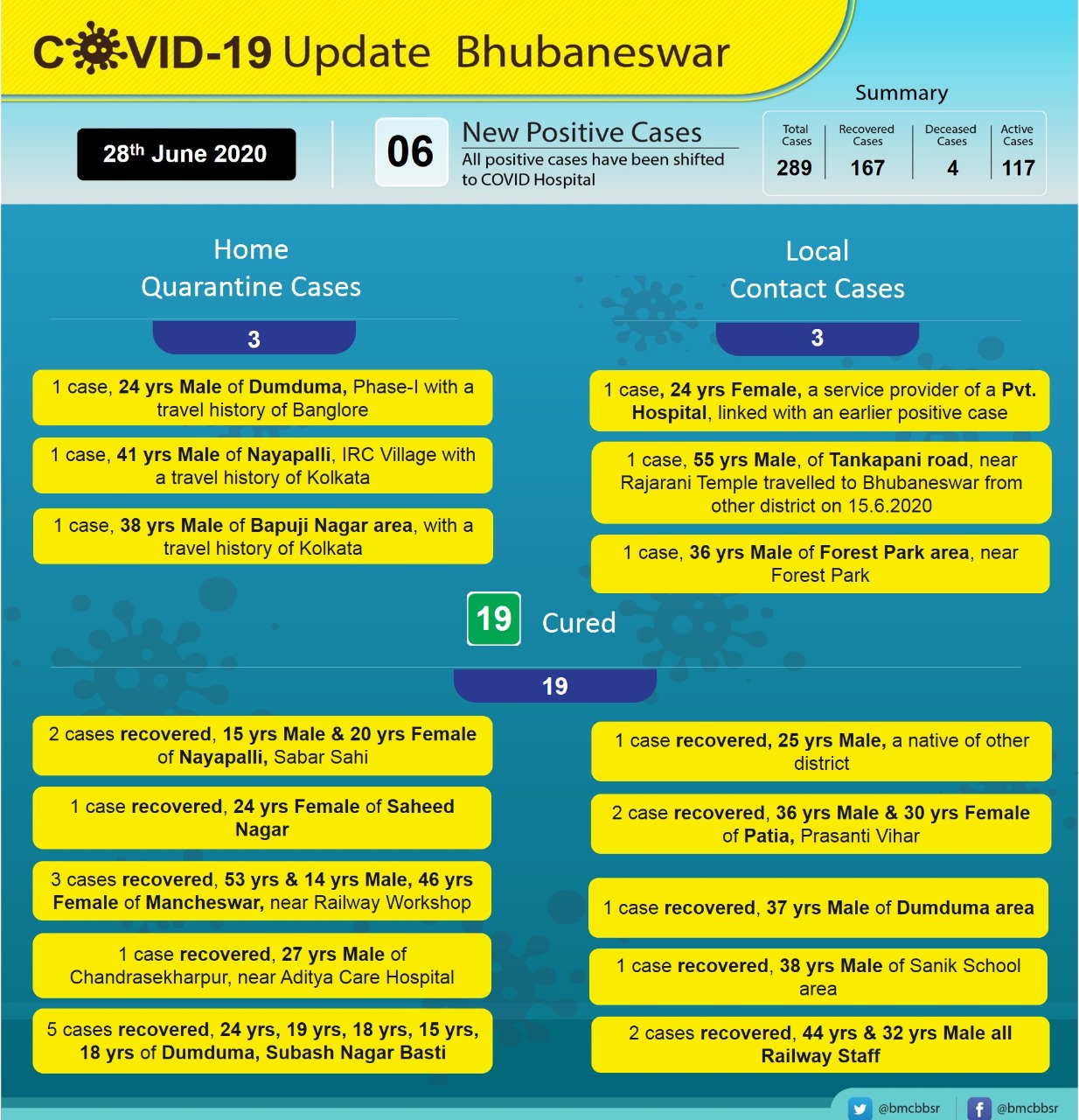 ସ୍ଥାନୀୟ ସଂକ୍ରମିତ ୩ଜଣଙ୍କ ମଧ୍ୟରୁ ଜଣେ ଘରୋଇ ହସ୍ପିଟାଲ, ଜଣେ ଟଙ୍କପାଣି ରୋଡ୍ ଓ ଅନ୍ୟଜଣେ ଫରେଷ୍ଟ ପାର୍କ ଅଞ୍ଚଳରୁ ଚିହ୍ନଟ ହୋଇଛନ୍ତି । ସେହିପରି ଭୁବନେଶ୍ୱରରୁ ଆଜି ୧୯ଜଣ ସୁସ୍ଥ ହୋଇଥିବା ସୂଚନା ମିଳିଛି ।