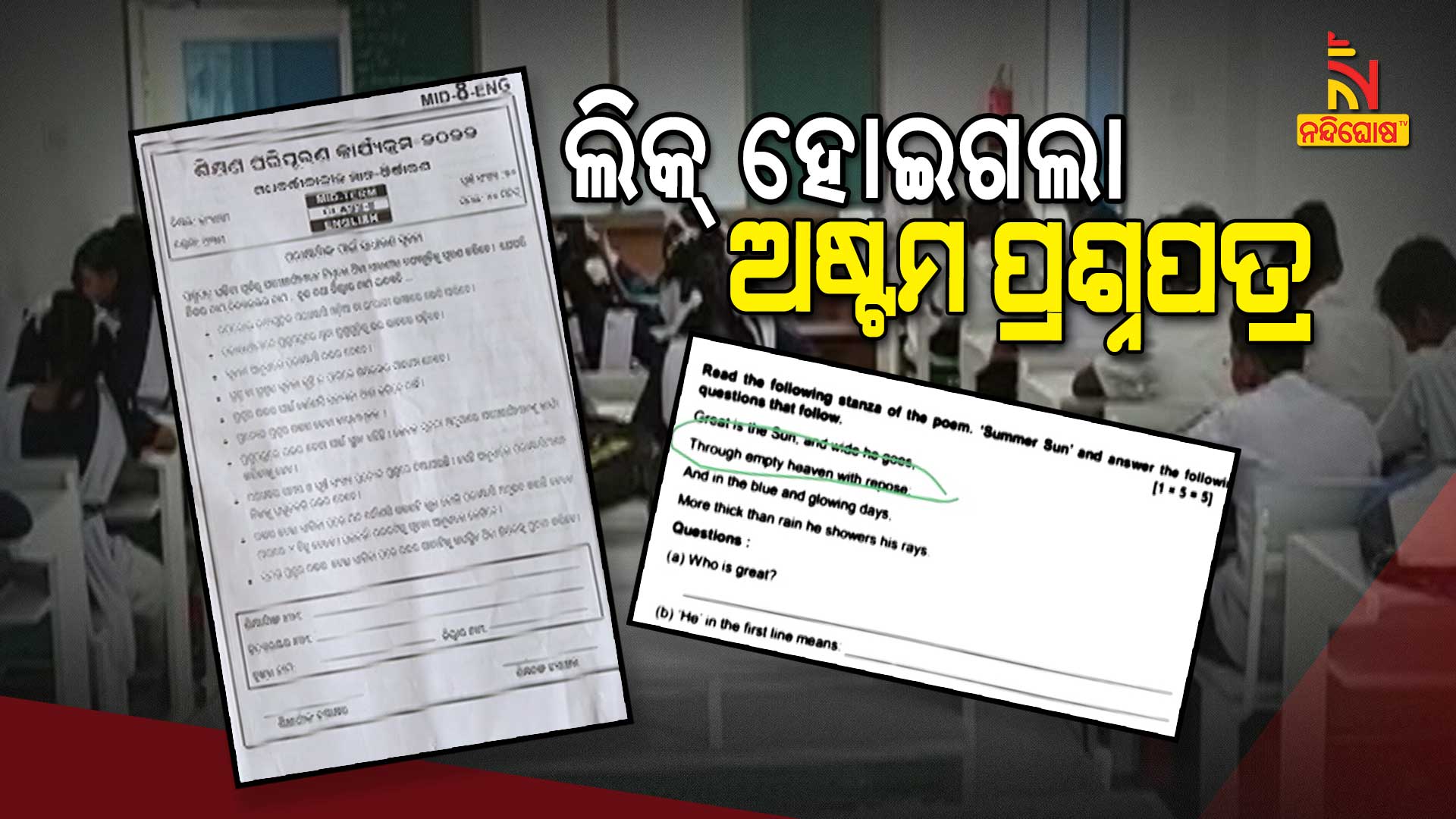 ଗଞ୍ଜାମ: ତୃତୀୟ ଶ୍ରେଣୀରୁ ଅଷ୍ଟମ ଶ୍ରେଣୀ ପର୍ଯ୍ୟନ୍ତ ଆରମ୍ଭ ହୋଇଥିବା ପରୀକ୍ଷାର ପ୍ରଶ୍ନପତ୍ର ଲିକ ହୋଇଥିବା ଅଭିଯୋଗ ହୋଇଛି । ସର୍ବଶୀକ୍ଷା ଅଭିଯାନ ପକ୍ଷରୁ ଏଲ. ଆର ପ୍ରୋଗ୍ରାମରେ ଆରମ୍ଭ ହୋଇଛି ମଧ୍ୟବର୍ତ୍ତୀ କାଳୀନ ପରୀକ୍ଷା । ଅଷ୍ଟମ ଶ୍ରେଣୀ ପିଲାଙ୍କ ଇଂରାଜୀ ବିଷୟର ପ୍ରଶ୍ନପତ୍ର ଭାଇରାଲ ହୋଇଥିବା ଜଣାପଡ଼ିଛି । ସୋସିଆଲ ମିଡ଼ିଆରେ ପ୍ରଶ୍ନପତ୍ର ଓ ଏହାର ଉତ୍ତର ଭାଇରଲ ହୋଇଥିବା ବେଳେ ଏହି ପୋଗ୍ରାମର ସଫଳତା ନେଇ ପ୍ରଶ୍ନ ଉଠିଛି ।