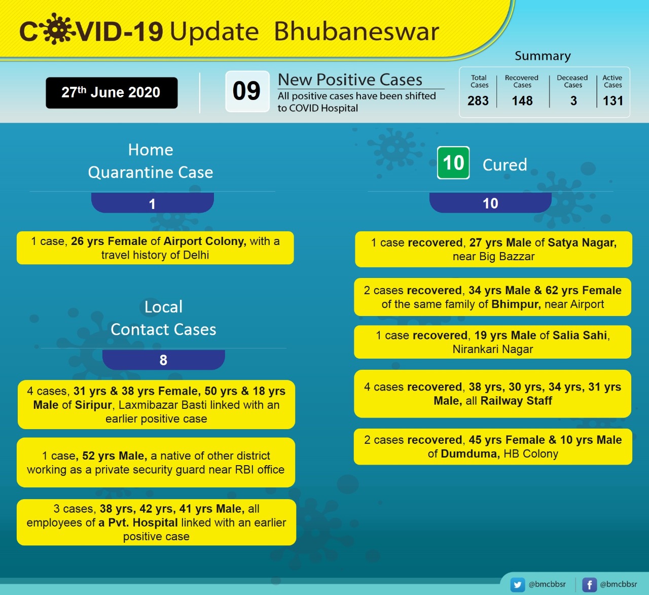ଏୟାରପୋର୍ଟ କଲୋନୀରୁ ଜଣେ ୨୬ ବର୍ଷିୟ ମହିଳା ଚିହ୍ନଟ ହୋଇଛନ୍ତି ଯିଏ ଦିଲ୍ଲୀରୁ ଫେରିଥିଲେ ବୋଲି ତାଙ୍କର ଟ୍ରାଭେଲ ହିଷ୍ଟ୍ରି କହୁଛି । ଅନ୍ୟ ୮ ଜଣଙ୍କ ମଧ୍ୟରୁ ୪ ଜଣ ସିରିପୁର ସ୍ଥିତ ଲକ୍ଷ୍ମିବଜାର ବସ୍ତିରୁ ଚିହ୍ନଟ ହୋଇଛନ୍ତି । ଜଣେ ଆରବିଆଇ ଅଫିସ୍ ପାଖ ସିକ୍ୟୁରିଟି ଗାର୍ଡ ହୋଇଥିବା ବେଳେ ଅନ୍ୟ ୩ ଜଣ ଏକ ଘରୋଇ ହସ୍ପିଟାଲରୁ ଚିହ୍ନଟ ହୋଇଛନ୍ତି ଯେଉଁ ମାନେ କୋଭିଡ ରୋଗୀଙ୍କର ସଂସ୍ପର୍ଶରେ ଆସିଥିଲେ ।