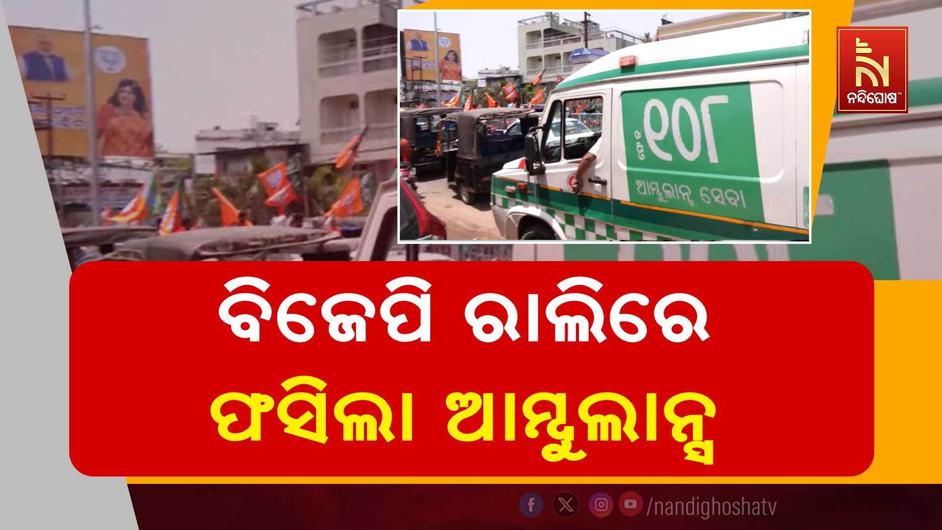 ଭୁବନେଶ୍ବର: ବିଜେପି ରାଲିରେ ଫସିଗଲା ୧୦୮ ଆମ୍ବୁଲାନ୍ସ। OD 02-BN- 7098 ନମ୍ବର ଥିବା ୧୦୮ ଆମ୍ବୁଲଆନ୍ସଟି ଆଜି ଭୁବନେଶ୍ବରରେ ପୁରୀ- କଟକ ରୋଡରେ ଫସିଯାଇଥିଲା। ଭୁବନେଶ୍ବର ଏକାମ୍ର ବିଜେପି ବିଧାୟକ ପ୍ରାର୍ଥୀ ବାବୁ ସିଂଙ୍କ ନାମାଙ୍କନ ରାଲି ଯୋଗୁଁ ଗୋଟେ ପଟ ବନ୍ଦ ହୋଇ ସିଙ୍ଗଲ ୱେ ହୋଇଯାଇଥିଲା।
