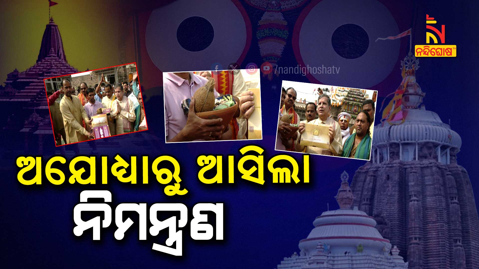 ପୁରୀ: ଅଯୋଧ୍ୟାରୁ ଆସିଲା ନିମନ୍ତ୍ରଣ । ଆସନ୍ତା ୨୨ତାରିଖରେ ଅଯୋଧ୍ୟାରେ ପ୍ରଭୁ ଶ୍ରୀରାମଙ୍କ ପ୍ରାଣ ପ୍ରତିଷ୍ଠା କାର୍ଯ୍ୟକ୍ରମ ରହିଛି | ଏଥିରେ ବହୁ ମାନ୍ୟଗଣ୍ୟ ବ୍ୟକ୍ତି ବିଶେଷ ଯୋଗଦେବାର କାର୍ଯ୍ୟକ୍ରମ ରହିଛି | ତେବେ ପ୍ରଭୁଙ୍କ ପ୍ରାଣ ପ୍ରତିଷ୍ଠା କାର୍ଯ୍ୟକ୍ରମରେ ମହାପ୍ରଭୁ ଶ୍ରୀଜଗନ୍ନାଥଙ୍କୁ ନିମନ୍ତ୍ରଣ କରିଛି ଅଯୋଧ୍ୟା ଅଭ୍ୟର୍ଥନା କମିଟି | ଆଜି ମହାପ୍ରଭୁଙ୍କ ନିମନ୍ତ୍ରଣ ନିମନ୍ତେ ଗୁଆ, ଅରୁଆ ଚାଉଳ, ଶ୍ରୀଫଳ, ପାନ, ଗାମୁଛା ଓ ନିମନ୍ତ୍ରଣ ପତ୍ର ନେଇ କମିଟି ଶ୍ରୀମନ୍ଦିରରେ ମହାପ୍ରଭୁଙ୍କୁ ନିମନ୍ତ୍ରଣ କରିଛି |