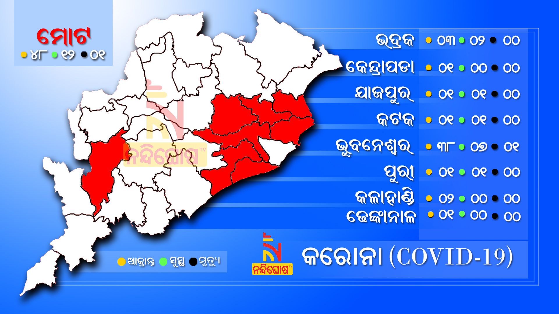 ରାଜଧାନୀରେ ମୋଟ ୩୮ ଜଣ କରୋନାରେ ଆକ୍ରାନ୍ତ ହୋଇଥିବା ବେଳେ ୭ ଜଣ ସୁସ୍ଥ ହୋଇଛନ୍ତି । ଭଦ୍ରକର ୩ ଆକ୍ରାନ୍ତଙ୍କ ମଧ୍ୟରୁ ୨ ଜଣ କଟକ, ପୁରୀ, ଯାଜପୁରର ଆକ୍ରାନ୍ତ ସମସ୍ତ ୩ ଜଣ ଆରୋଗ୍ୟ ଲାଭ କରିଛନ୍ତି ।