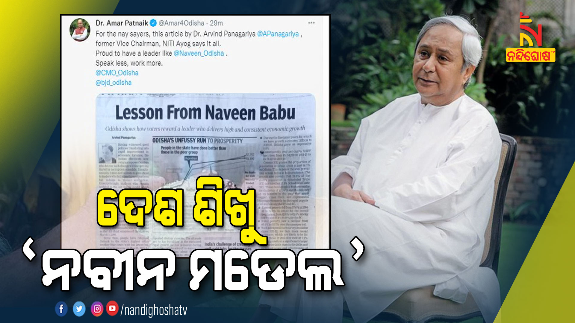 ୧୯୯୯ ମହାବାତ୍ୟା ପରେ ରାଜ୍ୟର ଏକ ପ୍ରତିକୂଳ ସ୍ଥିତିରୁ ରାଜ୍ୟକୁ ଦେଶର ଅଗ୍ରଣୀ ରାଜ୍ୟ ପରିଣତ କରିଛନ୍ତି ନବୀନ ପଟ୍ଟନାୟକ । ନବୀନଙ୍କ ଦୂରଦୃଷ୍ଟି, ସ୍ୱଚ୍ଛ ଓ ସ୍ଥିର ସରକାର ଯୋଗୁଁ ଏହା ସମ୍ଭବ ହୋଇପାରିଛି । ନୀତି ଆୟୋଗର ପ୍ରଥମ ଉପାଧ୍ୟକ୍ଷ ଅରବିନ୍ଦ ପାନଗାରିଆଙ୍କ ସ୍ତମ୍ଭ ତଥ୍ୟ ସମ୍ଭଳିତ ଏବଂ ଓଡ଼ିଶାର ପରିବର୍ତ୍ତିତ ବିକାଶର ପ୍ରକୃତ ଚିତ୍ର ବୟାନ କରୁଛି ।
