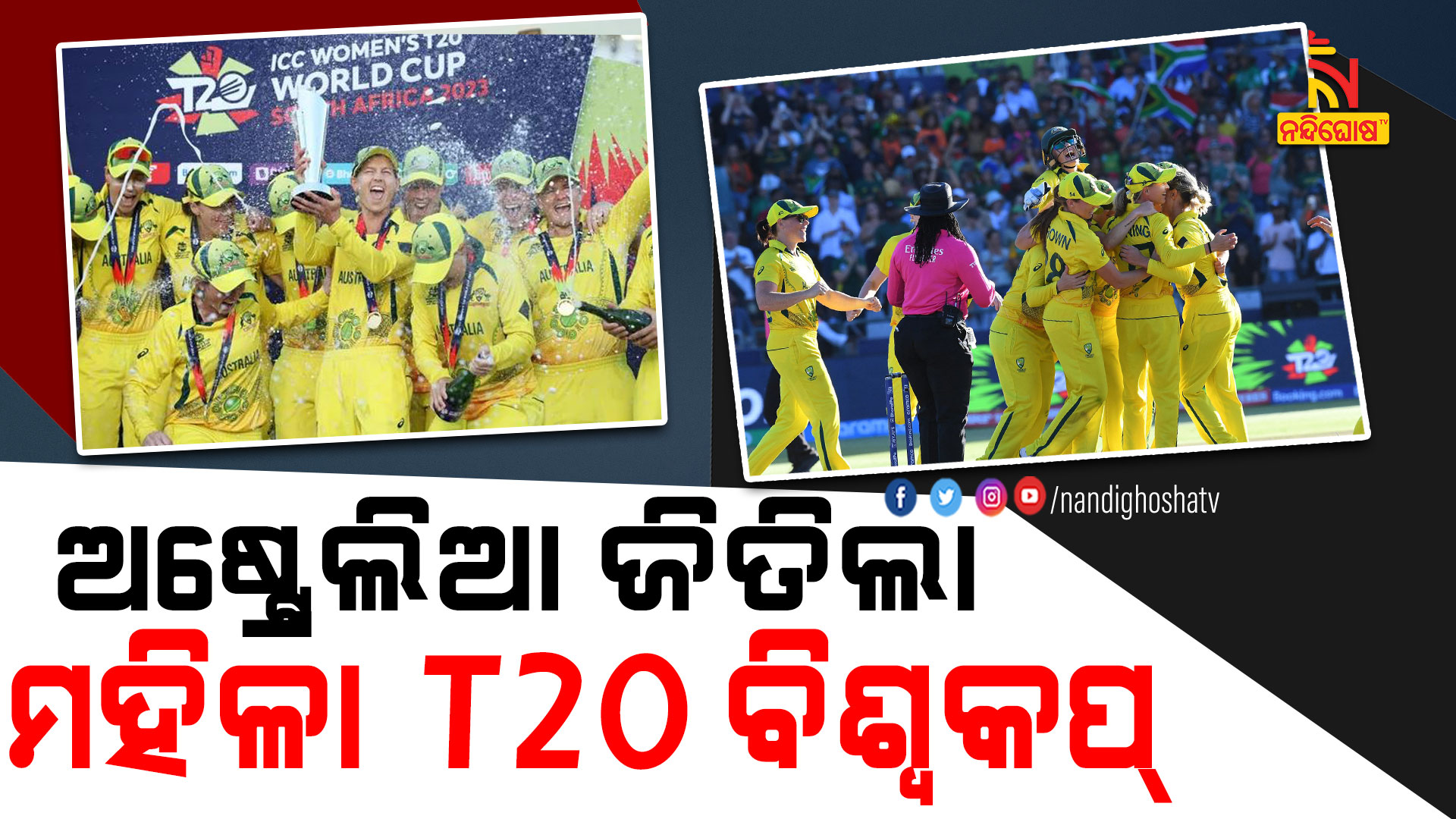 କେପଟାଉନ୍: ଅଷ୍ଟ୍ରେଲିଆ ବିଶ୍ବବିଜେତା । ମହିଳା T20 ବିଶ୍ବକପ୍ରେ ଚାମ୍ପିଅନ ହେଲା ଅଷ୍ଟ୍ରେଲିଆ । ଷଷ୍ଠ ଥର ପାଇଁ ଟାଇଟଲ ହାତେଇଲା କଙ୍ଗାରୁ ଦଳ । କେପ୍ ଟାଉନରେ ଖେଳାଯାଇଥିବା ଫାଇନାଲରେ ଦକ୍ଷିଣ ଆଫ୍ରିକାକୁ ୧୯ ରନରେ ହରାଇଛି ଅଷ୍ଟ୍ରେଲିଆ ।