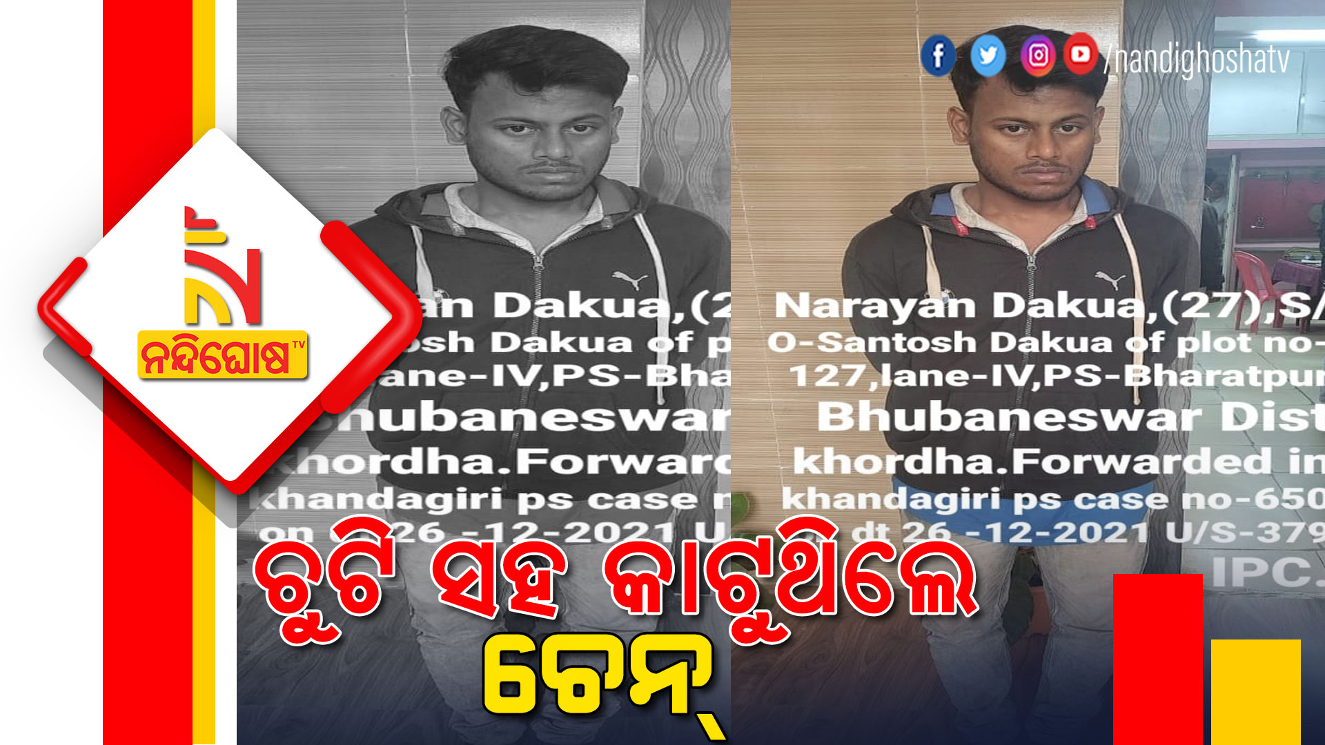 ପୁଲିସ୍ ସୂଚନାନୁଯାୟୀ , ନାରାୟଣ ଡୁମୁଡୁମା ଫେଜ୍ – ୨ରେ ଥିବା ଏସ୍ଆର୍କେ ସେଲୁନ୍ରେ କାମ କରେ | ଗତ ୨୫ ତାରିଖରେ ସୌମ୍ୟରଞ୍ଜନ ପଣ୍ଡା ନାମକ ଜଣେ ଯୁବକ ଚୁଟି କାଟିବାକୁ ଉକ୍ତ ସେଲୁନ୍କୁ ଯାଇଥିଲେ । ସୌମ୍ୟଙ୍କ ଚୁଟି କାଟୁ କାଟୁ ଅତି ଚତୁରତାର ସହ ତାଙ୍କ ବେକରୁ ୧୨ ଗ୍ରାମର ସୁନା ଚେନ୍ଟିକୁ କାଟି ନେଇଥିଲା ନାରାୟଣ । ପରେ ଏନେଇ ସୌମ୍ୟ ଖଣ୍ଡଗିରି ଥାନାରେ ଅଭିଯୋଗ କରିଥିଲେ । ଏତଲା ଆଧାରାରେ ପୁଲିସ ଘଟଣାର ତଦନ୍ତ କରି ନାରାୟଣକୁ ଗିରଫ କରିବା ସହ ତା ’ ପାଖରୁ ଚୋରି ସୁନାଚେନ୍ ଜବତ କରିଛି ।