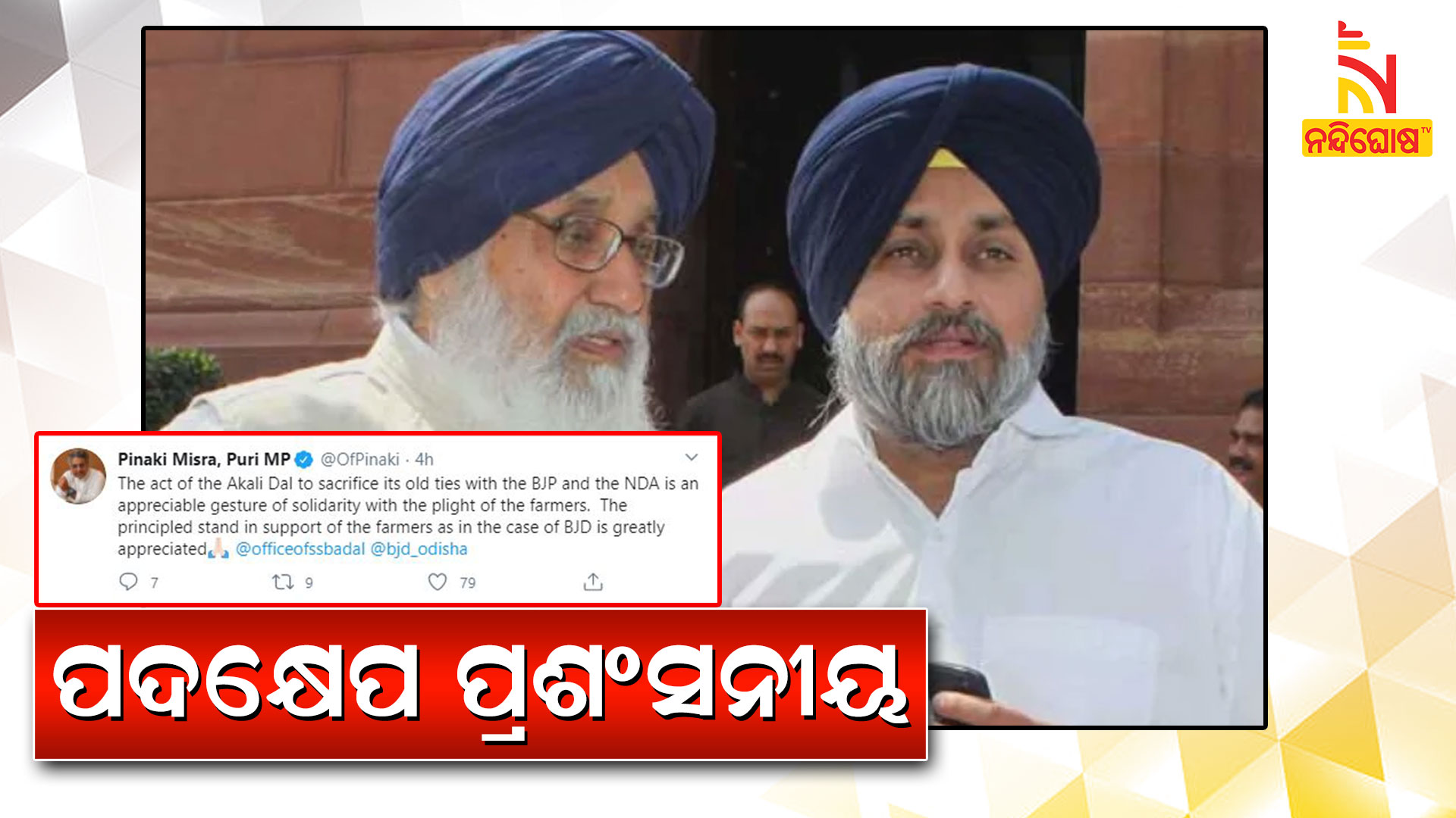 The act of the Akali Dal to sacrifice its old ties with the BJP and the NDA is an appreciable gesture of solidarity with the plight of the farmers. The principled stand in support of the farmers as in the case of BJD is greatly appreciated🙏🏻 @officeofssbadal @bjd_odisha