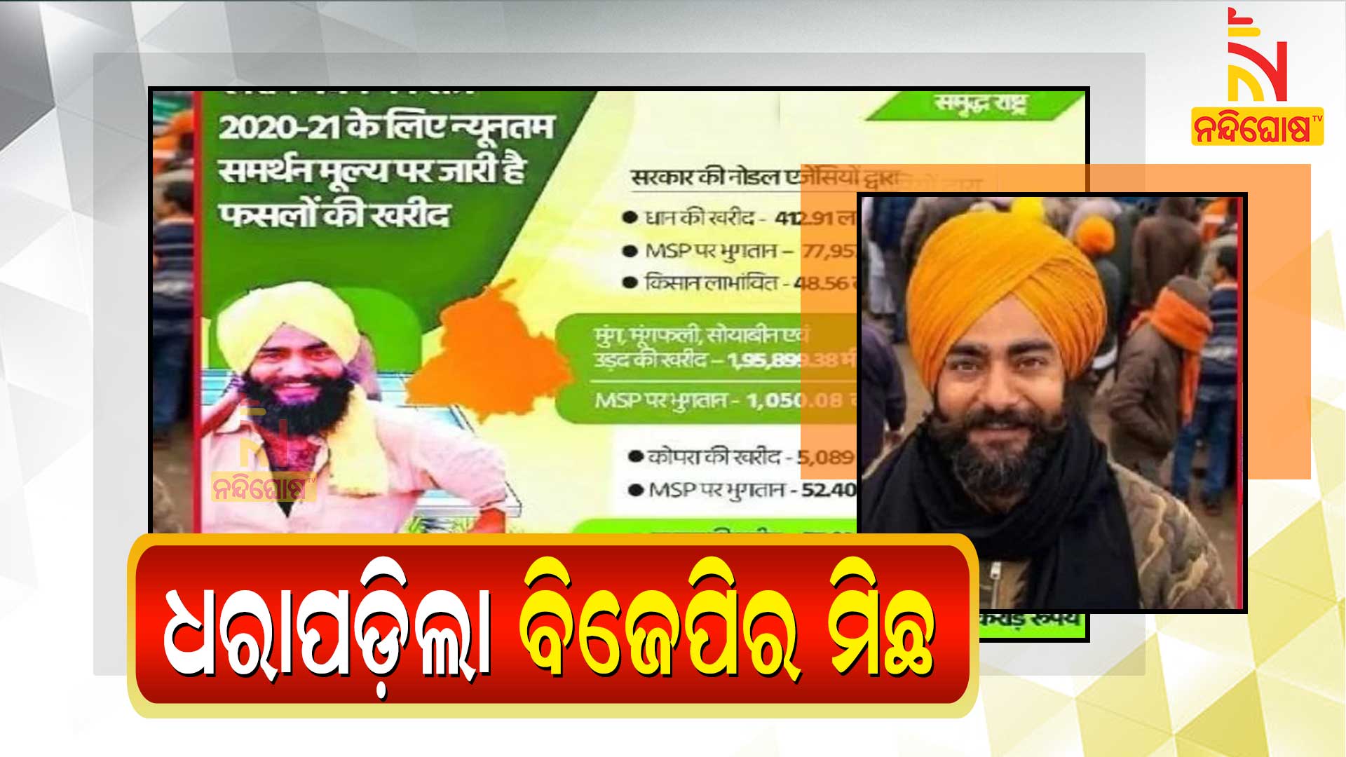 ନୂଆଦିଲ୍ଲୀ: କେନ୍ଦ୍ର ସରକାରଙ୍କ ନୂଆ କୃଷି ଆଇନ ବିରୋଧରେ ୨୮ ଦିନ ହେଲାଣି ଆନ୍ଦୋଳନ ଜାରି ରହିଛି। ଏବେ ଏହି ଆନ୍ଦୋଳନ ନୂଆ ମୋଡ଼ ନେଇଛି। ବିଜେପି ସରକାରଙ୍କ ଅସଲ ଚେହେରା ସାମ୍ନାକୁ ଆସିଯାଇଛି। ନିକଟରେ ବିଜେପି ତରଫରୁ ଏକ ଫଟୋ ଜାରି କରି କୁହାଯାଇଥିଲା ଯେ ପଞ୍ଜାବର ଚାଷୀମାନେ ଏମଏସପିକୁ ନେଇ ଖୁସି ଅଛନ୍ତି। ତେବେ ଏହି ପୋଷ୍ଟରରେ ଯେଉଁ ଚାଷୀଙ୍କ ଫଟୋ ରହିଛି ସେ ବି ଆନ୍ଦୋଳନରେ ସାମିଲ ହୋଇଛନ୍ତି।