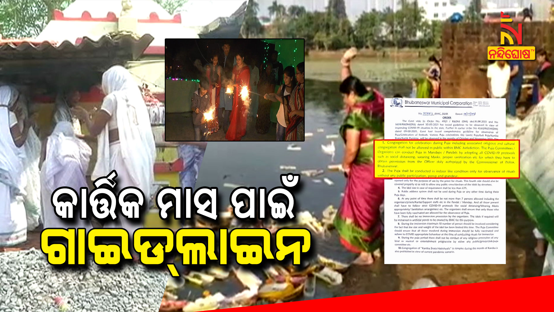 ଭୁବନେଶ୍ୱର: କାର୍ତ୍ତିକ ମାସ ପାଇଁ ପୂଜା ଗାଇଡ୍ଲାଇନ ଜାରି କଲା ବିଏମସି । ରାଜଧାନୀରେ ଲକ୍ଷ୍ମୀ ପୂଜାରୁ କାର୍ତ୍ତିକ ପୂର୍ଣ୍ଣିମା ପର୍ଯ୍ୟନ୍ତ ହେବାକୁ ଥିବା ପୂଜା ଲାଗି ମାର୍ଗଦର୍ଶିକା ଜାରି କରିଛି ଭୁବନେଶ୍ବର ମ୍ୟୁନିସିପାଲିଟି କର୍ପୋରେସନ। କରୋନା କଟକଣାରେ ପୂଜା ପାଳନ ହେବ।
