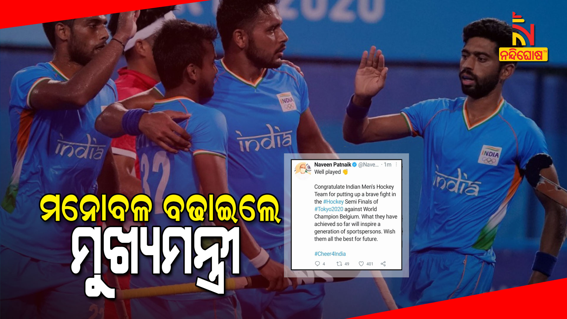 ଭୁବନେଶ୍ୱର: ସେମିଫାଇନାଲରେ ବେଲଜିୟମ ଠାରୁ ୫-୨ରେ ହାରିଲା ଭାରତୀୟ ପୁରୁଷ ହକି ଦଳ। ହାରିବା ପରେ ଭାରତୀୟ ହକି ଟିମର ମନୋବଳ ବଢାଇଛନ୍ତି ମୁଖ୍ୟମନ୍ତ୍ରୀ ନବୀନ ପଟ୍ଟନାୟକ। ସେମିରେ ବେଲଜିଅମ ସହ ଟକ୍କରରେ ଖୁବ ସାହସିକତାର ସହ ପ୍ରଦର୍ଶନ କରିଛି ଇଣ୍ଡିଆନ ଟିମ୍ ବୋଲି କହିଛନ୍ତି ମୁଖ୍ୟମନ୍ତ୍ରୀ। ଖେଳପ୍ରେମୀଙ୍କୁ ଭାରତୀୟ ହକି ଟିମ୍ଙ୍କ ଏହି ପ୍ରୟାସ ଖୁବ ଉତ୍ସାହିତ କରିଛି। ସେମିରେ ହାରିବା ପରେ ଏବେ ବ୍ରୋଞ୍ଜ ପଦକ ପାଇଁ ଖେଳିବ ଟିମ୍ ଇଣ୍ଡିଆ। ସେଥିପାଇଁ ଶୁଭେଚ୍ଛା ଜଣାଇଛନ୍ତି ନବୀନ। ସେପଟେ ପ୍ରଧାନମନ୍ତ୍ରୀ ନରେନ୍ଦ୍ର ମୋଦି ସେମି ଫାଇନାଲ ମ୍ୟାଚ୍ ଦେଖୁଥିବା ଟ୍ୱିଟ୍ କରିଥିଲେ। ମ୍ୟାଚ୍ ସରିବା ପରେ ଭାରତୀୟ ହକି ଟିମ୍ର ଭଲ ଡିଫେଣ୍ଡକୁ ପ୍ରଶଂସା କରିଛନ୍ତି। ଆଗାମୀ ମ୍ୟାଚ୍ ପାଇଁ ସେ ଶୁଭେଚ୍ଛା ଜଣାଇଛନ୍ତି। ଦେଶ ଭାରତୀୟ ହକି ଟିମ୍ ପାଇଁ ଗର୍ବିତ ବୋଲି କହିଛନ୍ତି ପ୍ରଧାନମନ୍ତ୍ରୀ।
