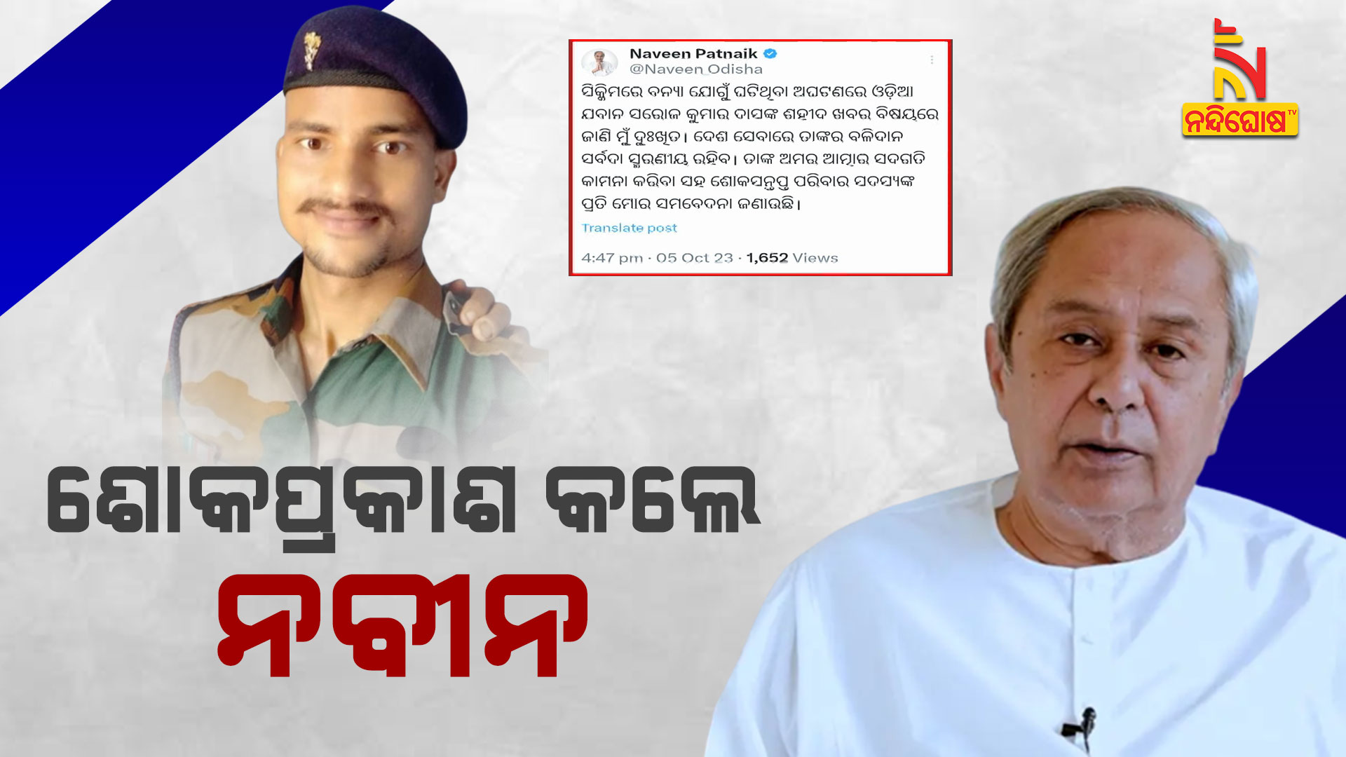 ସିକିମ: ସିକିମରେ ବନ୍ୟା ଯୋଗୁଁ ଘଟିଥିବା ଅଘଟଣରେ ଓଡ଼ିଆ ଯବାନ ସରୋଜ କୁମାର ଦାସଙ୍କ ଶହୀଦ ଖବର ବିଷୟରେ ଜାଣି ମୁଁ ଦୁଃଖିତ। ଦେଶ ସେବାରେ ତାଙ୍କର ବଳିଦାନ ସର୍ବଦା ସ୍ମରଣୀୟ ରହିବ। ତାଙ୍କ ଅମର ଆତ୍ମାର ସଦଗତି କାମନା କରିବା ସହ ଶୋକସନ୍ତପ୍ତ ପରିବାର ସଦସ୍ୟଙ୍କ ପ୍ରତି ମୋର ସମବେଦନା ଜଣାଉଛି।