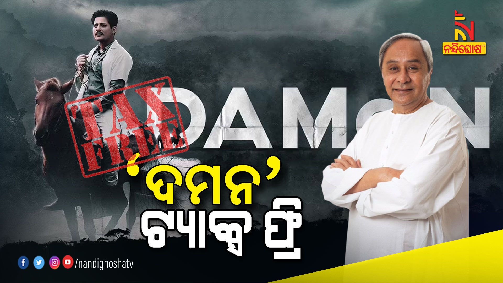 ଭୁବନେଶ୍ବର: ଓଡିଶା ସରକାରଙ୍କ ମ୍ୟାଲେରିଆ ନିରାକରଣ କାର୍ଯ୍ୟକ୍ରମ ଉପରେ ନିର୍ମିତ ଚଳଚ୍ଚିତ୍ର ‘ଦମନ’ ର ପ୍ରଦର୍ଶନକୁ ମୁଖ୍ୟମନ୍ତ୍ରୀ ନବୀନ ପଟ୍ଟନାୟକ ସମ୍ପୂର୍ଣ୍ଣ ଟିକସ ମୁକ୍ତ ଘୋଷଣା କରିଛନ୍ତି । ବାସ୍ତବ ଜୀବନରେ ମାଲକାନଗିରିର ଦୁର୍ଗମ ଅଞ୍ଚଳରେ ସ୍ୱାସ୍ଥ୍ୟ ସେବା ଯୋଗାଇବାରେ ଜଣେ ଯୁବ ଡାକ୍ତର ମାନବିକତାର ଯେଉଁ ନୂଆ ଉଦାହରଣ ସ୍ରୁଷ୍ଟି କରିଛନ୍ତି ତାହା ଏ ଚଳଚ୍ଚିତ୍ରର ବିଷୟ ବସ୍ତୁ ।