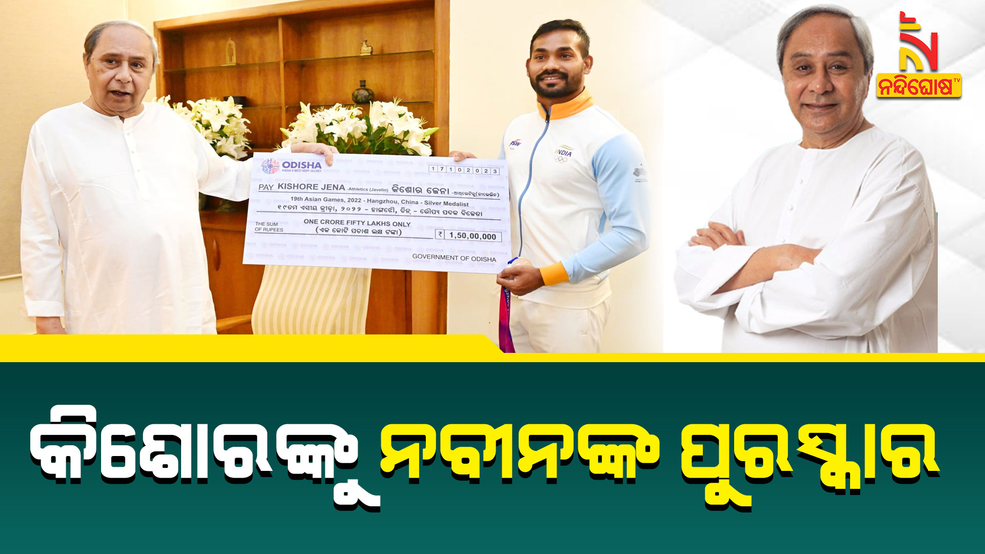 ଭୁବନେଶ୍ବର: ଏସିଆନ ଗେମ୍ସ ଜାଭଲିନ ଥ୍ରୋରେ ରୌପ୍ୟ ପଦକ ଜିତିଥିବା କିଶୋର କୁମାର ଜେନାଙ୍କୁ ଦେଢ଼ କୋଟି ଟଙ୍କାର ଚେକ୍ ପ୍ରଦାନ କରିବା ସହ ସମ୍ବର୍ଦ୍ଧିତ କଲେ ମୁଖ୍ୟମନ୍ତ୍ରୀ ନବୀନ ପଟ୍ଟନାୟକ । ଅଲିମ୍ପିକ୍ସ ଯୋଗ୍ୟତା ପାଇଁ ଅଭିନନ୍ଦନ ଜଣାଇବା ସହ ସମସ୍ତ ସହଯୋଗ ଯୋଗାଇ ଦେବାକୁ ଦେଲେ ପ୍ରତିଶ୍ରୁତି । କିଶୋର ଏସିଆନ ଗେମ୍ସରେ ବ୍ୟକ୍ତିଗତ ଶ୍ରେଷ୍ଠ ୮୭.୫୪ ମିଟର ଥ୍ରୋ କରିବା ସହ ରୌପ୍ୟ ପଦକ ହାସଲ କରିଥିଲେ ।