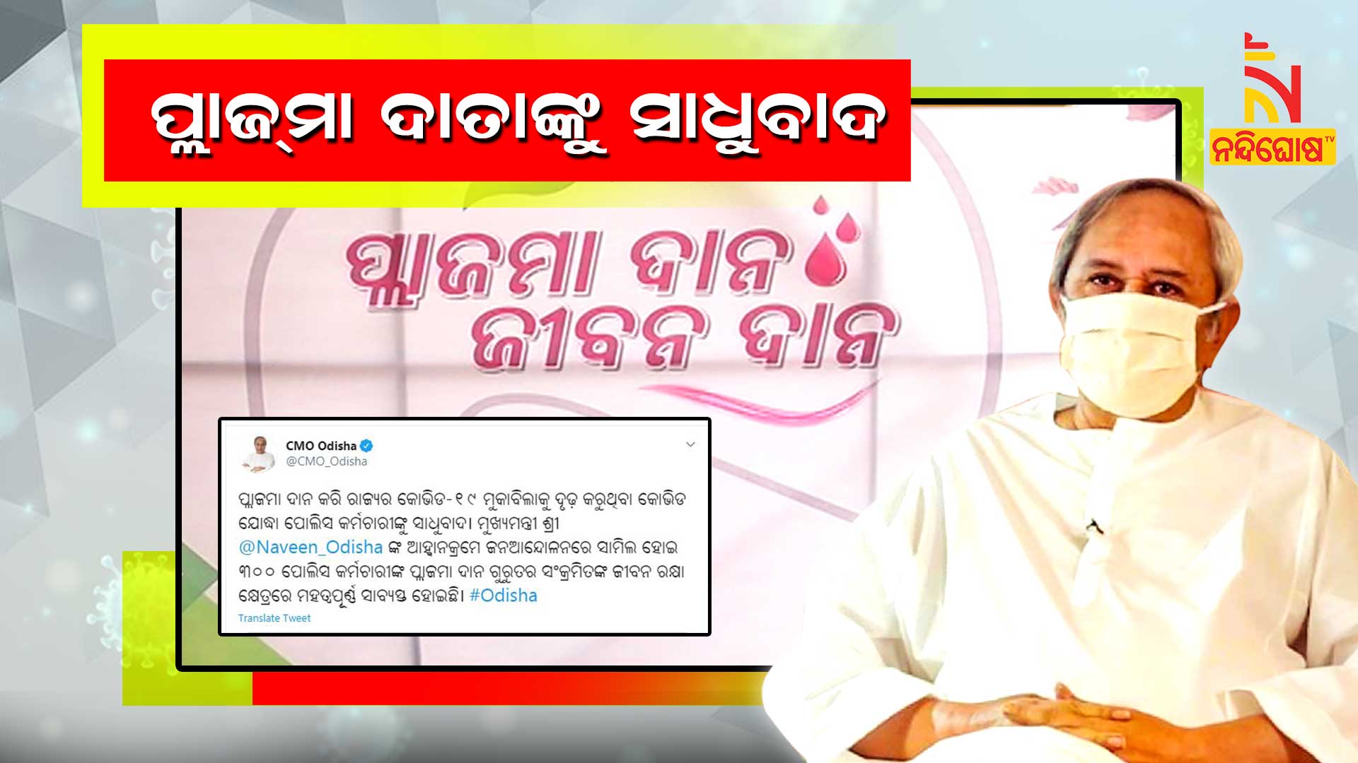 ଭୁବନେଶ୍ୱର: ଗାନ୍ଧୀ ଜୟନ୍ତୀ ଅବସରରେ ମୁଖ୍ୟମନ୍ତ୍ରୀ ନବୀନ ପଟ୍ଟନାୟକ ସମସ୍ତ ପ୍ଲାଜ୍ମା ଦାତାଙ୍କୁ ସାଧୁବାଦ ଜଣାଇଛନ୍ତି । ସେ ନିଜ ଟ୍ୱିଟ୍ ହ୍ୟାଣ୍ଡେଲରେ କହିଛନ୍ତି ଯେ, ପ୍ଲାଜମା ଦାନ କରି ରାଜ୍ୟର କୋଭିଡ-୧୯ ମୁକାବିଲାକୁ ସୁଦୃଢ଼ କରୁଥିବା କୋଭିଡ୍ ଯୋଦ୍ଧା ପୋଲିସ କର୍ମଚାରୀଙ୍କୁ ଅନେକ ଅନେକ ସାଧୁବାଦ ।