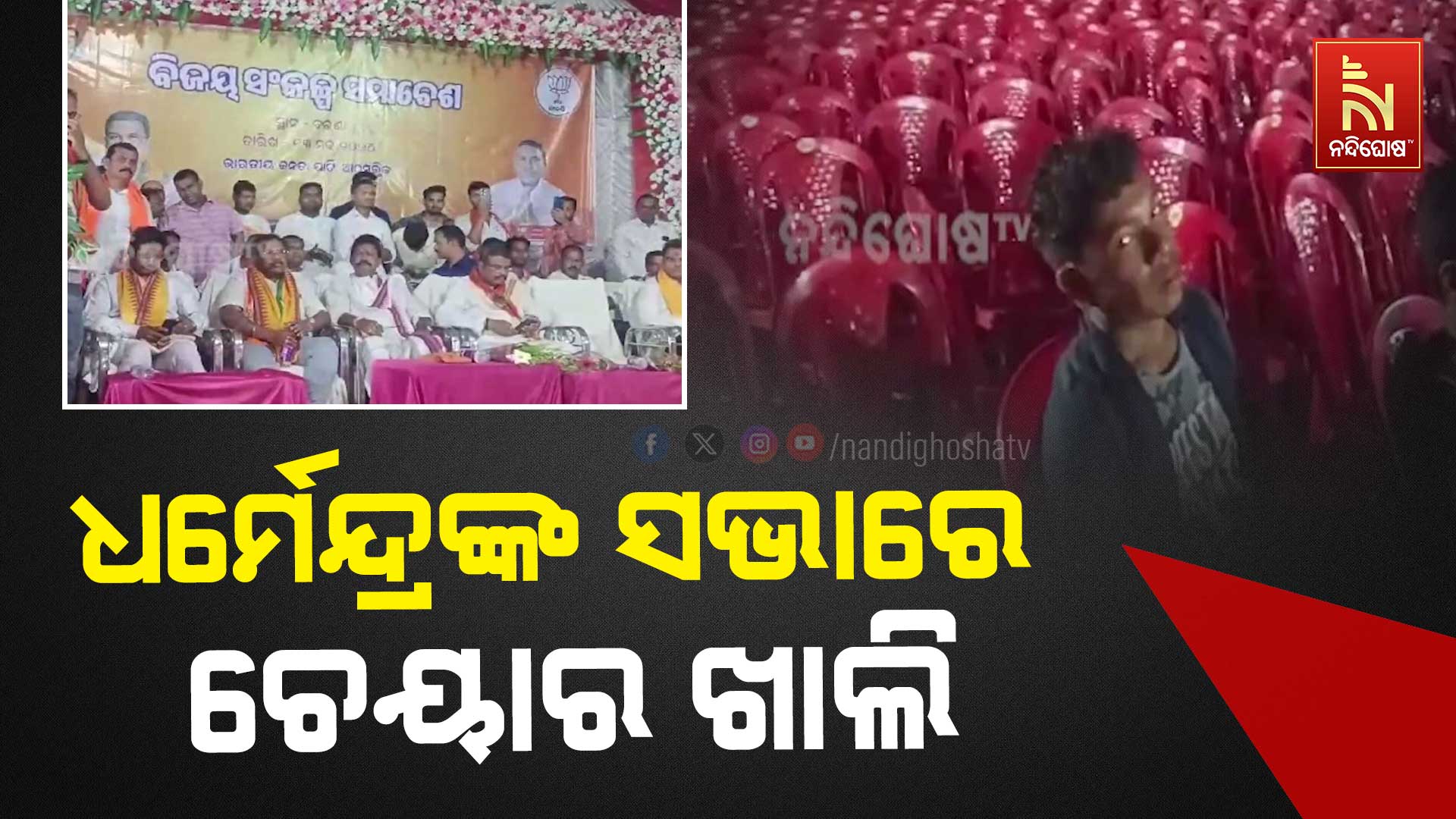 କେଉଁଠି ଚେୟାର ଖାଲି, କେଉଁଠି ଲୋକ ଉଠିକି ପଳୋଉଛନ୍ତି । ହଜାର ହଜାର ଚେୟାର ପଡ଼଼ିଛି, ହେଲେ ମୁଣ୍ଡ ଗଣିଦେବା ବେଳକୁ ଶହେ ଲୋକ ବି ହେଉନାହାନ୍ତି । ସମ୍ବଲପୁରରେ ଏମିତି ଲୋକହସା ହେଉଛନ୍ତି କେନ୍ଦ୍ରମନ୍ତ୍ରୀ ତଥା ବିଜେପିର ସମ୍ବଲପୁର ଲୋକସଭା ପ୍ରାର୍ଥୀ ଧର୍ମେନ୍ଦ୍ର ପ୍ରଧାନ । ଆଠମଲ୍ଲିକ ବିଧାନସଭା ନିର୍ବାଚନମଣ୍ଡଳିର ବଇଣ୍ଡାଠାରେ ହୋଇଥିବା ଏ ସଭା ଉପରେ ନଜର ପକାନ୍ତୁ । ୧୩ ମେରେ ବିଜେପି ଆୟୋଜନ କରିଥିଲା ବିଜୟ ସଂକଳ୍ପ ସମାବେଶ ।
