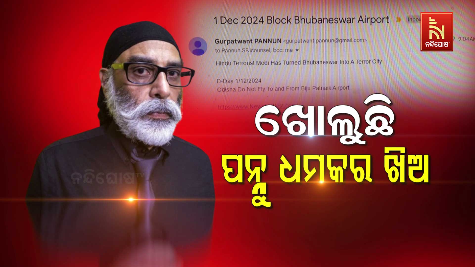 ସୂଚନାଯୋଗ୍ୟ, ଜଣେ ଓଡ଼ିଆ ସାମ୍ବାଦିକଙ୍କ ପାଖକୁ ଆସିଥିଲା ପନ୍ନୁର ଏହି ଧମକପୂର୍ଣ୍ଣ ମେଲ୍ । ଏଥିରେ ଡିସେମ୍ବର ୧ ତାରିଖରେ ଭୁବନେଶ୍ବର ବିଜୁ ପଟ୍ଟନାୟକ ବିମାନ ବନ୍ଦରରୁ ଉଡ଼ାଣ ନଭରିବାକୁ ଚେତାବନୀ ଦେଇଥିଲା ପନ୍ନୁ ।
