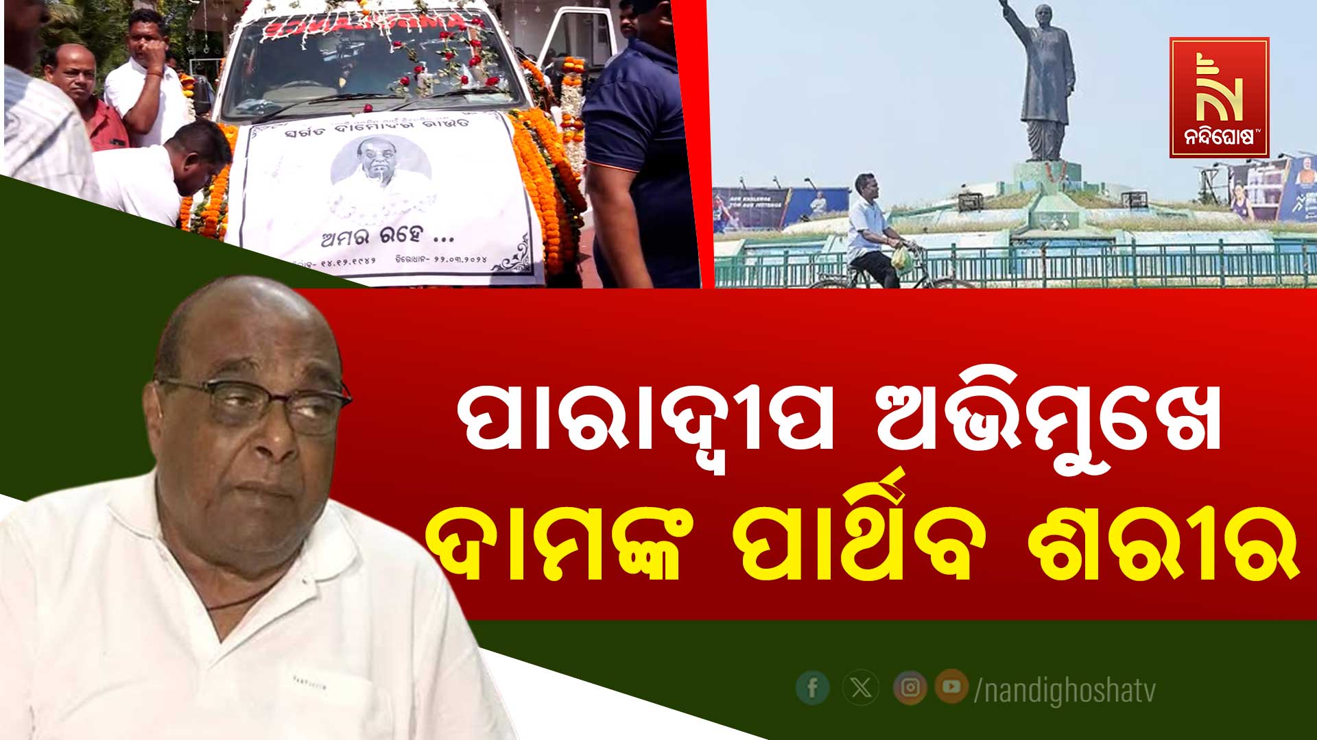 ଭୁବନେଶ୍ୱର : ପାରାଦୀପ-ଏରସମା ଅଭିମୁଖେ ଡାକ୍ତର ଦାମ ରାଉତଙ୍କ ପାର୍ଥିବ ଶରୀର। ପୁରୀ ସ୍ଵର୍ଗଦ୍ଵାରରେ ହେବ ଶେଷକୃତ୍ୟ। ପାରାଦୀପ ଯିବା ରାସ୍ତାରେ ପ୍ରଥମେ ରଘୁନାଥପୁରରେ କିଛି ସମୟ ରହିବେ। ସେଠାରୁ ତିର୍ତ୍ତୋଲରେ କିଛି ସମୟ ରହିବା ପରେ କୁଜଙ୍ଗ ବଜାରରେ ଶେଷ ଦର୍ଶନ ଲାଗି କିଛି ସମୟ ଲାଗି ଅଟକିବ। ପାରାଦ୍ଵୀପରେ ପରିକ୍ରମା ସହିତ ବିଜୁପଟ୍ଟନାୟକ ମେମୋରିଆଲ ଟ୍ରଷ୍ଟରେ ଶେଷ ଦର୍ଶନ ଲାଗି ରହିବ ପାର୍ଥିବ ଶରୀର। ସେଠାରୁ ଏରସମା ପରିକ୍ରମା ପରେ ପୁରୀ ସ୍ଵର୍ଗଦ୍ଵାର ଅଭିମୁଖେ ବାହାରିବ ଦାମୋଦର ରାଉତଙ୍କ ପାର୍ଥିବ ଶରୀର।
