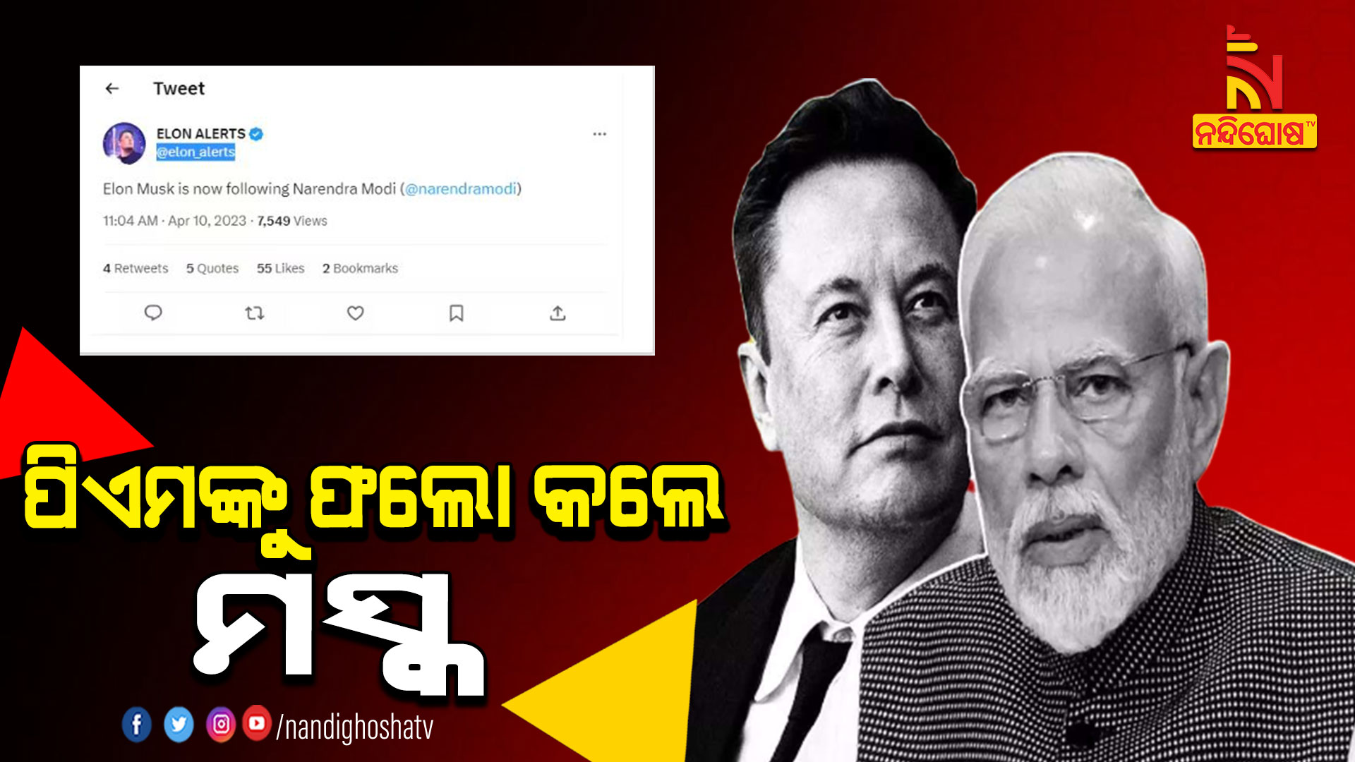ନୂଆଦିଲ୍ଲୀ: ମାଇକ୍ରୋ ବ୍ଲଗିଂ ସାଇଟ ଟ୍ବିଟର ମାଲିକ ଏଲନ ମସ୍କ ପ୍ରଧାନମନ୍ତ୍ରୀ ନରେନ୍ଦ୍ର ମୋଦିଙ୍କୁ ଫଲୋ କରିଛନ୍ତି । ମସ୍କଙ୍କର ଏଲନ ଆଲର୍ଟ ନାଁରେ ଥିବା ଆକାଉଣ୍ଟର ଏହାକୁ ନେଇ ଏକ ଟ୍ବିଟ କରିଛି ।