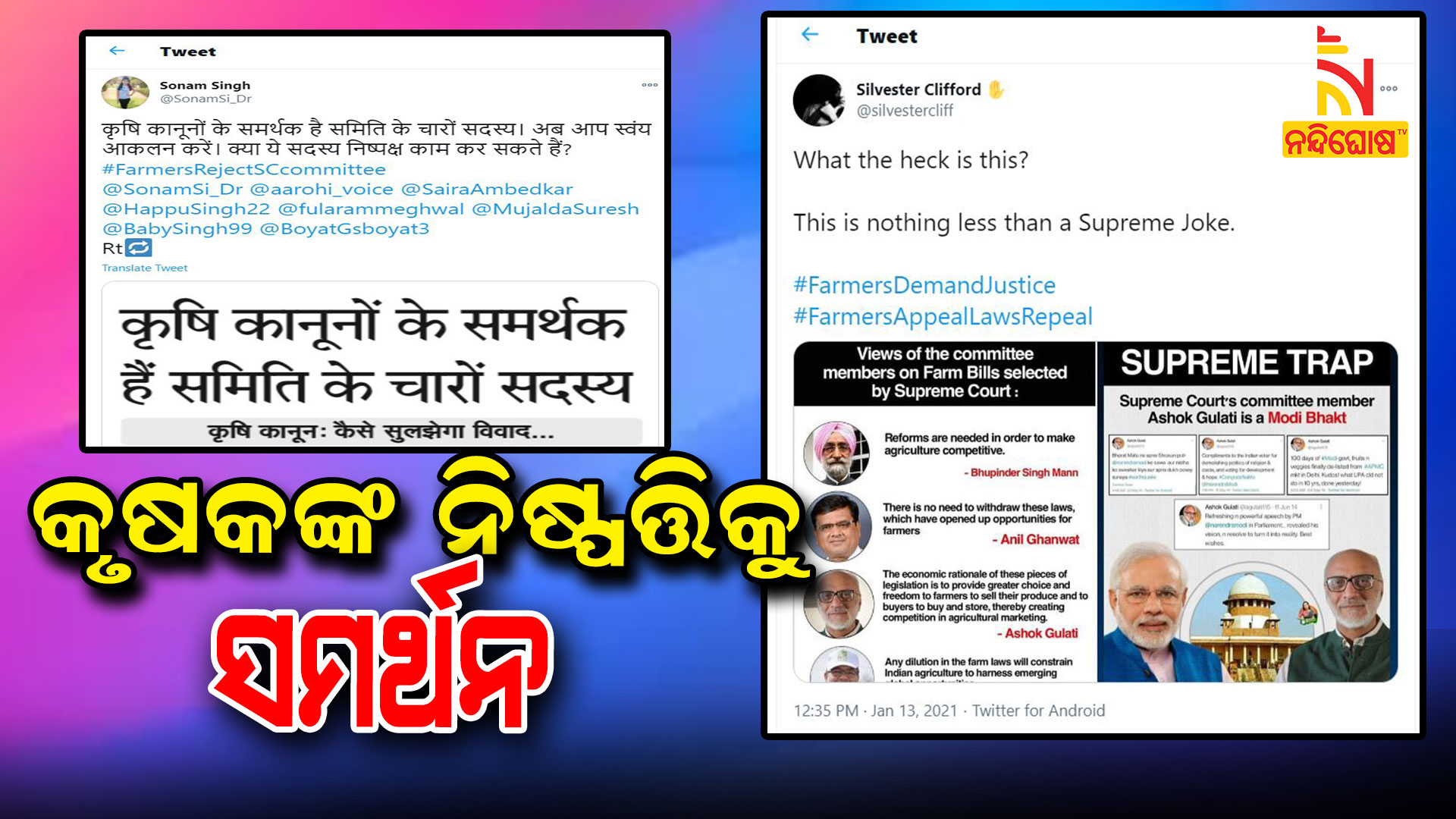 ଅପରପକ୍ଷରେ କୃଷକଙ୍କ ଏଭଳି ନିଷ୍ପତ୍ତିକୁ ବିଭିନ୍ନ ବର୍ଗରୁ ସମର୍ଥନ ମିଳିଛି । ଯାହା ଝଲକ ସୋସିଆଲ୍ ମିଡିଆରେ ମଧ୍ୟ ଦେଖିବାକୁ ମିଳିଛି । କମିଟି ଗଠନର ପରାମର୍ଶକୁ ପ୍ରତ୍ୟାଖ୍ୟାନ କାହିଁକି ଠିକ୍ ଏ ନେଇ ଯୁକ୍ତି ବାଢ଼ିଛନ୍ତି ସୋସିଆଲ୍ ମିଡିଆ ବ୍ୟବହାରକାରୀ । ଜଣେ ଟ୍ୱିଟର ୟୁଜରଙ୍କ ପକ୍ଷରୁ ଲେଖାଯାଇଛି ଯେ, ପ୍ରଥମର ହିଁ ଚାଷୀ ବିଲକୁ ସମର୍ଥନ କରୁଥିବା ଏବଂ ସରକାରଙ୍କୁ ସମର୍ଥନ କରିଆସୁଥିବା ଲୋକଙ୍କୁ କିମିଟି ସଦସ୍ୟ ରହିବେ । ସେମାନେ ବିଭିନ୍ନ ସମୟରେ ଖବର କାଗଜରେ ଲେଖା ଲେଖି କୃଷି ଆଇନ ଠିକ୍ ଏ ନେଇ ଯୁକ୍ତି ବାଢ଼ିଛନ୍ତି । ଏଭଳି ପରିସ୍ଥିତିରେ କିଭଳି କୃଷକଙ୍କୁ କିଭଳି ନ୍ୟାୟ ମିଳିପାରିବ ବୋଲି ପ୍ରଶ୍ନ କରିଛନ୍ତି ।
