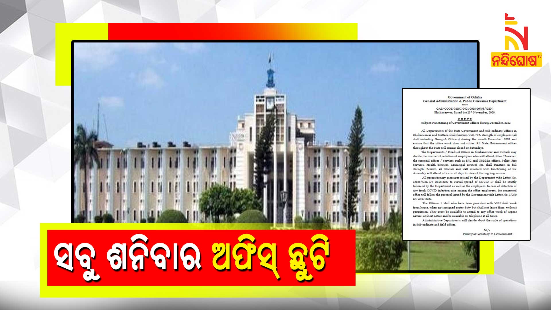 ଗ୍ରୁପ୍ ‘ଏ’ ଅଧିକାରୀଙ୍କୁ ମିଶାଇ ୭୫ ପ୍ରତିଶତ କର୍ମଚାରୀରେ ସରକାରୀ କାର୍ଯ୍ୟାଳୟ ଡିସେମ୍ବର ମାସରେ ଟ୍ୱିନ୍ ସିଟିରେ ଚାଲିବ । ରାଜ୍ୟ ସରକାରଙ୍କ ସମସ୍ତ କାର୍ଯ୍ୟାଳୟ ଡିସେମ୍ବର ମାସର ସବୁ ଶନିବାର ବନ୍ଦ ରହିବ । ତେବେ, କେଉଁ ବିଭାଗର କେଉଁ ଅଧିକାରୀ ଆଉ କର୍ମଚାରୀ ଅଫିସ୍ ଆସିବେ କି ନାହିଁ ତାହା ଉପରିସ୍ଥ ଅଧିକାରୀ ନିଷ୍ପତ୍ତି ନେବେ । ଜରୁରୀକାଳୀନ ସେବା ଯେମିତି SRC ଓ OSDMA କାର୍ଯ୍ୟାଳୟ, ପୋଲିସ, ଅଗ୍ନିଶମ, ସ୍ୱାସ୍ଥ୍ୟ, ପୌର ସଂସ୍ଥା କାର୍ଯ୍ୟାଳୟ ଶହେ ପ୍ରତିଶତ କର୍ମଚାରୀଙ୍କୁ ନେଇ ସବୁଦିନ କାର୍ଯ୍ୟ କରିବ ।