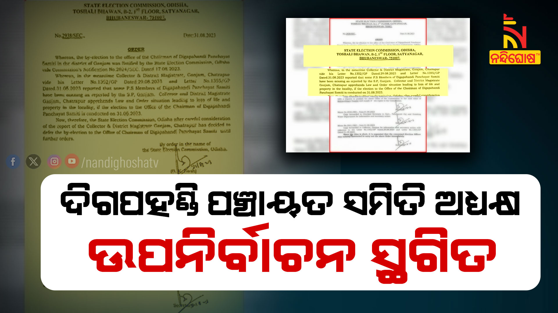 ଗଞ୍ଜାମ: ଗଞ୍ଜାମ ଜିଲ୍ଲା ଦିଗପହଣ୍ଡି ପଞ୍ଚାୟତ ସମିତି ଅଧ୍ୟକ୍ଷ ଉପ-ନିର୍ବାଚନ ସ୍ଥଗିତ । ଆଇନ ଶୃଙ୍ଖଳା ପରିସ୍ଥିତି ସୃଷ୍ଟି ହେବା ଆଶଙ୍କା ଥିବାରୁ ଉପନିର୍ବାଚନ ସ୍ଥଗିତ ରଖାଯାଇଛି । ଉପନିର୍ବାଚନ ସ୍ଥଗିତ ରଖିବାକୁ ରାଜ୍ୟ ନିର୍ବାଚନ କମିଶନ ନିର୍ଦ୍ଦେଶ ଦେଇଛନ୍ତି । ଗଞ୍ଜାମ ଜିଲ୍ଲାପାଳଙ୍କ ରିପୋର୍ଟ ଆାଧାରରେ ସ୍ଥଗିତ ରହିଛି ଉପ ନିର୍ବାଚନ । କିଛି ସମିତି ସଭ୍ୟଙ୍କୁ ନିର୍ଦ୍ଦିଷ୍ଟ ଗୋଷ୍ଠୀ ଲୁଚାଇ ରଖିଥିବା ଅଭିଯୋଗ ହୋଇଛି । ଏନେଇ ଥାନାରେ ଅଭିଯୋଗ ହୋଇଛି ।