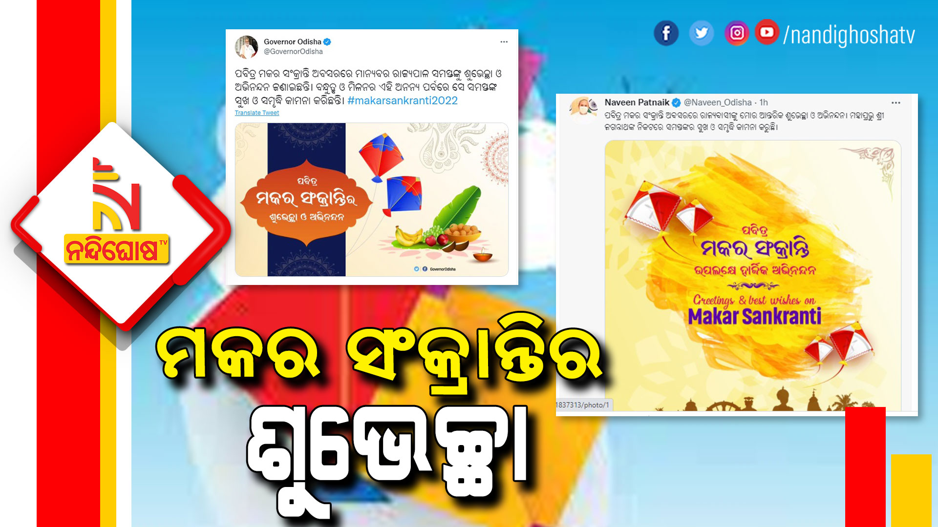ସେହିପରି ମକର ସଂକ୍ରାନ୍ତି ଅବସରରେ ରାଜ୍ୟବାସୀଙ୍କୁ ଆନ୍ତରିକ ଶୁଭେଚ୍ଛା ଓ ଅଭିନନ୍ଦନ ଜଣାଇଛନ୍ତି ମୁଖ୍ୟମନ୍ତ୍ରୀ ନବୀନ ପଟ୍ଟନାୟକ । ମୁଖ୍ୟମନ୍ତ୍ରୀ ନବୀନ ପଟ୍ଟନାୟକ ଟ୍ୱିଟ କରି ଶୁଭେଚ୍ଛା ଜଣାଇଛନ୍ତି । ମହାପ୍ରଭୁ ଶ୍ରୀ ଜଗନ୍ନାଥଙ୍କ ନିକଟରେ ସମସ୍ତଙ୍କର ସୁଖ ଓ ସମୃଦ୍ଧି କାମନା କରିଛନ୍ତି ମୁଖ୍ୟମନ୍ତ୍ରୀ ନବୀନ ପଟ୍ଟନାୟକ । ସେହିପରି ପବିତ୍ର ମକର ସଂକ୍ରାନ୍ତି ଅବସରରେ ଟ୍ୱିଟ୍ କରି ସମସ୍ତଙ୍କୁ ଶୁଭେଚ୍ଛା ଜଣାଇଛନ୍ତି ବିଜେଡି ସାଂଗଠନିକ ସମ୍ପାଦକ ପ୍ରଣବ ପ୍ରକାଶ ଦାସ । ସମସ୍ତଙ୍କ ସୁଖ, ସମୃଦ୍ଧି ଓ ମଙ୍ଗଳମୟ ଜୀବନ କାମନା କରିଛନ୍ତି ବିଜେଡି ସାଂଗଠନିକ ସମ୍ପାଦକ ପ୍ରଣବ ପ୍ରକାଶ ଦାସ।