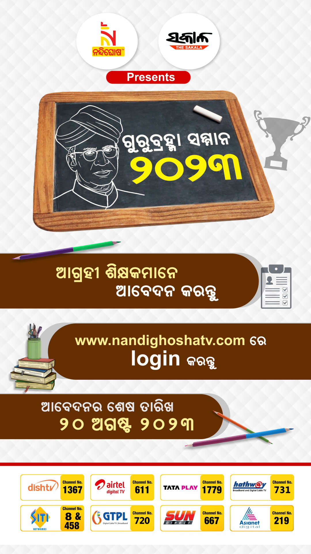ଭୁବନେଶ୍ବର: ଗୁରୁମାନଙ୍କୁ ସମ୍ମାନ ଜଣାଇବାକୁ ଦୈନିକ ସକାଳ ଓ ନନ୍ଦିଘୋଷ ଟିଭି ଭିନ୍ନ ଏକ ପ୍ରୟାସ ଆରମ୍ଭ କରିଛି । ଗୁରୁ ଦିବସ ଉପଲକ୍ଷେ ଗୁରୁ ମାନଙ୍କୁ ଗୁରୁବ୍ରହ୍ମା ସମ୍ମାନ ପ୍ରଦାନ କରିବେ ଦୈନିକ ସକାଳ ଓ ନନ୍ଦିଘୋଷ ଟିଭି । ଆଗ୍ରହୀ ଶିକ୍ଷକ ଓ ଶିକ୍ଷୟତ୍ରୀ ମାନେ nandighoshatv.com ରେ login କରନ୍ତୁ ।