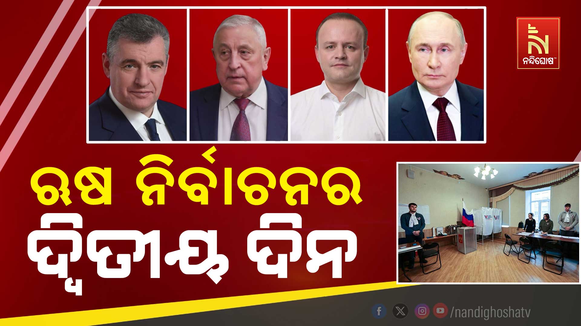 ସେପଟେ ଋଷର ନିର୍ବାଚନ ପ୍ରକ୍ରିୟା ଆରମ୍ଭ ବେଳେ ବିଭିନ୍ନ ସୀମା ଅଞ୍ଚଳରେ ବୋମାମାଡ କରିଛି ୟୁକ୍ରେନ । କେରଳରେ ବି ବାସ କରୁଥିବା ଋଷ ନାଗରିକ ନିଜ ମତ ସାବ୍ୟସ୍ତ କରିଥିବା ସୂଚନା ମିଳିଛି । ଋଷ ଓ ଋଷ ଅଧିକୃତ ଅଞ୍ଚଳରେ ୧୧୨ ଦଶମିକ ୩ ନିୟୁତ ଭୋଟ ନିର୍ବାଚନ ପ୍ରକ୍ରିୟାରେ ସାମିଲ ହୋଇଛନ୍ତି। ଗତ ୨୦୧୨ରୁ ବର୍ତ୍ତମାନ ଯାଏ ରାଷ୍ଟ୍ରପତି ଅଛନ୍ତି ପୁଟିନ। ନିର୍ବାଚନରେ କମ୍ଯୁନିଷ୍ଟ ପାର୍ଟିର ନିକୋଲାଇ କାରିତୋନୋଭ, ଲିବରାଲ ଡେମୋକ୍ରାଟିକ ପାର୍ଟି ଅଫ ଋଷିଆର ଲିଓନିଦ ସ୍ଲଟସ୍କି, ନ୍ଯୁ ପିପୁଲ ପଲିଟିକାଲ ପାର୍ଟିର ଭ୍ଲାଦିସ୍ଲାଭ ଦାଭାନକୋଭ।