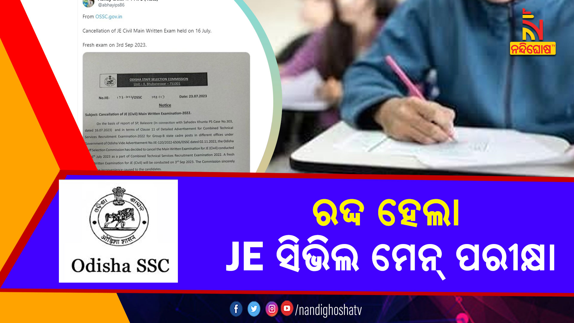 ଭୁବନେଶ୍ୱର: ରଦ୍ଦ ହେଲା କନିଷ୍ଠ ଯନ୍ତ୍ରୀ (ସିଭିଲ) ମେନ୍ ଲିଖିତ ପରୀକ୍ଷା-୨୦୨୨ । ପରୀକ୍ଷା ରଦ୍ଦ ନେଇ ଓଏସଏସସି ପକ୍ଷରୁ ସୂଚନା । ବାଲେଶ୍ବର ଏସପି ସାଗରିକା ନାଥଙ୍କ ରିପୋର୍ଟ ଆଧାରରେ ରଦ୍ଦ । ଗତ ୧୬ ତାରିଖରେ ହୋଇଥିବା ପରୀକ୍ଷା ରଦ୍ଦ । ଆସନ୍ତା ସେପ୍ଟେମ୍ବର ୩ରେ ପୁଣିଥରେ ହେବ ପରୀକ୍ଷା । ଏନେଇ ଟ୍ୱିଟ୍ କରି ସୂଚନା ଦେଇଛନ୍ତି ଓଏସଏସସି ସଚିବ ଅଭୟ । ଗତ ୧୬ ତାରିଖରେ ହୋଇଥିବା ପରୀକ୍ଷା ପୂର୍ବରୁ ପ୍ରଶ୍ନପତ୍ର ଡିଲ୍ ନେଇ ମିଳିଥିଲା ସୂଚନା । ଓଏସଏସସିର ସୂଚନା ଆଧାରରେ ରେଡ୍ କରିଥିଲା ବାଲେଶ୍ୱର ପୋଲିସ । ଓଡ଼ିଶା ସୀମାନ୍ତ ଦୀଘାରେ ହୋଇଥିଲା ରେଡ୍ । ଜଣେ ମହିଳାଙ୍କ ସମେତ ୯ ଜଣଙ୍କୁ କାବୁ କରିଥିଲା ପୋଲିସ । ଏହି ୯ଜଣ ଏକ ଆନ୍ତଃରାଜ୍ୟ ରାକେଟ ବୋଲି ମିଳିଛି ସୂଚନା ।