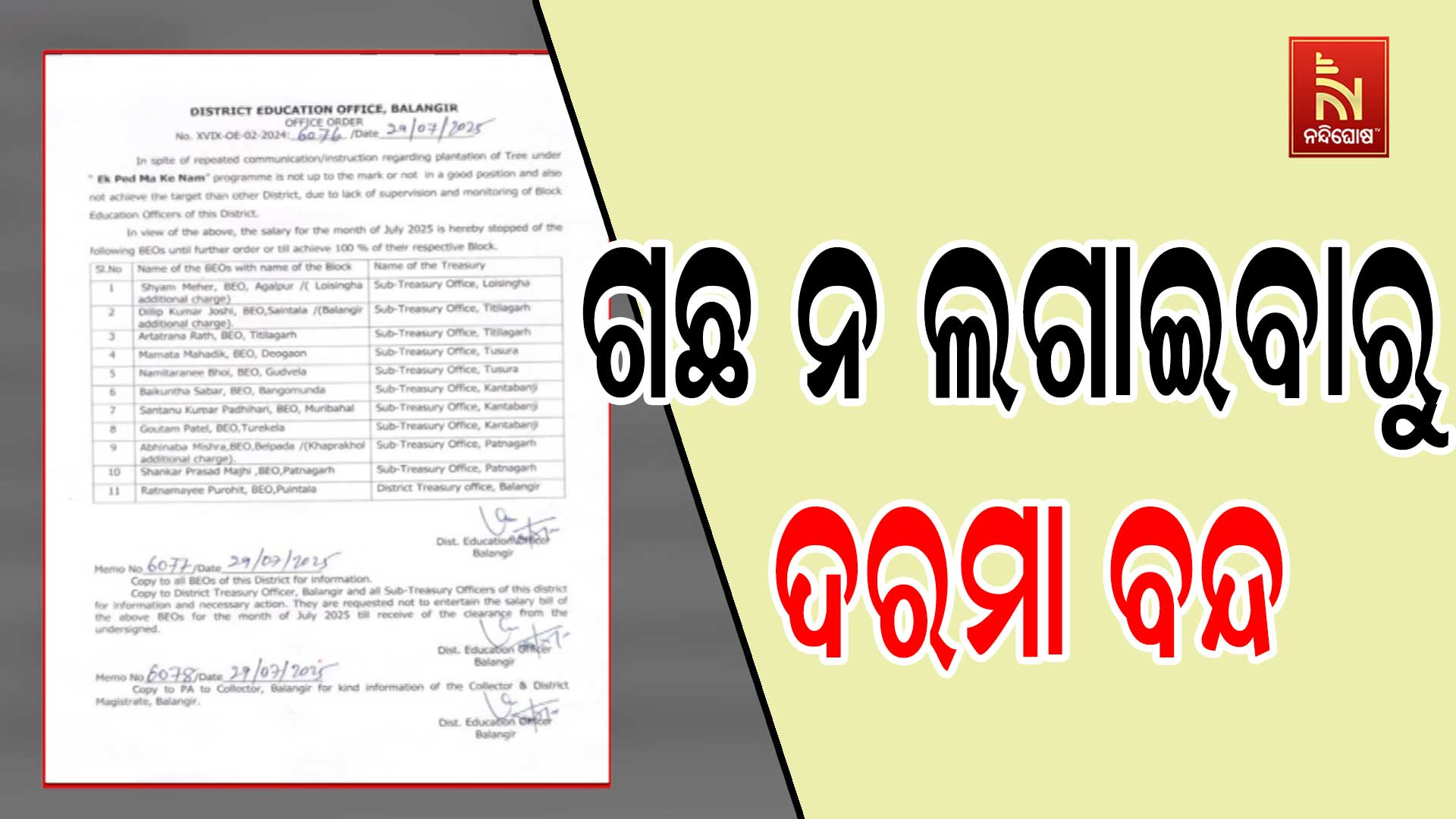 ବଲାଙ୍ଗୀର ଜିଲ୍ଲାର ୧୧ ବିଇଓଙ୍କ ଦରମା ବନ୍ଦ। ଜୁଲାଇ ମାସର ଦରମା ବନ୍ଦ କଲେ ଜିଲ୍ଲା ଶିକ୍ଷାଧିକାରୀ । ବନୀକରଣ ଟାର୍ଗେଟ ପୂରଣ ନହେବାରୁ ଦରମା ବନ୍ଦ ନିର୍ଦ୍ଦେଶ। ଏକ ପେଡ୍ ମା କେ ନାମ କାର୍ଯ୍ୟକ୍ରମରେ ବୃକ୍ଷରୋପଣ ପାଇଁ ଥିଲା ଟାର୍ଗେଟ। କାର୍ଯ୍ୟରେ ଅବହେଳା ଯୋଗୁଁ ଦରମା ବନ୍ଦ କଲେ ଡିଇଓ। ଆଗଲପୁର, ସଇଁତଳା, ଟିଟିଲାଗଡ଼, ଦେଓଗାଁ, ଗୁଡଭେଲା, ବଙ୍ଗୋମୁଣ୍ଡା, ମୁରିବାହାଲ, ତୁରେକେଲା, ବେଲପଡା,ପାଟଣାଗଡ଼, ପୁଇଁତଳା ବ୍ଲକର ବିଇଓଙ୍କ ଉପରେ ହୋଇଛି କାର୍ଯ୍ୟାନୁଷ୍ଠାନ।