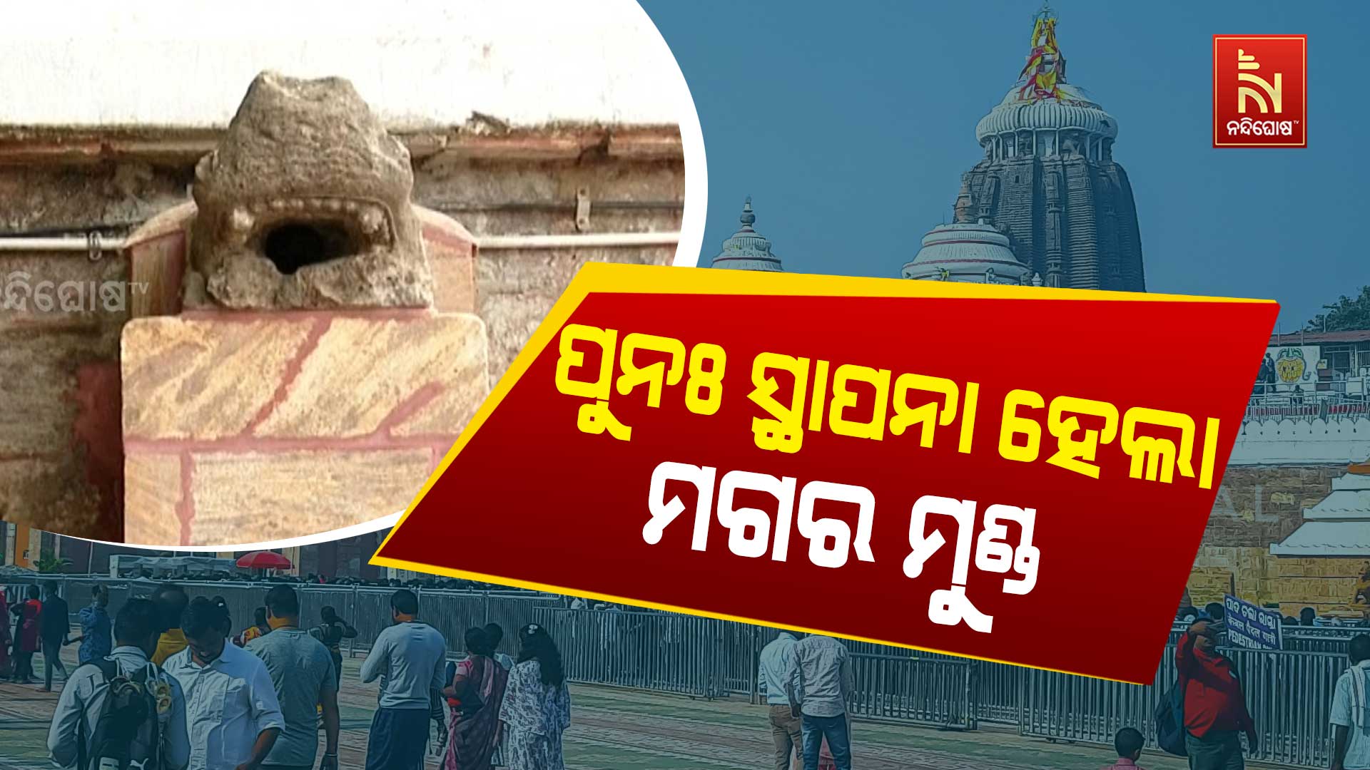 ପୁରୀ: ମହାପ୍ରଭୁ ଶ୍ରୀଜଗନ୍ନାଥଙ୍କ ମେଘନାଦ ପାଚେରୀରୁ ଭଙ୍ଗା ଯାଇଥିବା ମଗର ମୁଣ୍ଡ ପୁଣି ଥରେ ସ୍ଥାପନ କରାଯାଇଛି । ଗତ ୩ ତାରିଖରେ ଶ୍ରୀମନ୍ଦିର ଦକ୍ଷିଣ ଦ୍ୱାର ନିକଟ ମେଘନାଦ ପାଚେରୀରେ ଥିବା ଏହି ମଗର ମୁଣ୍ଡକୁ ଭଙ୍ଗା ଯାଇଥିଲା ।