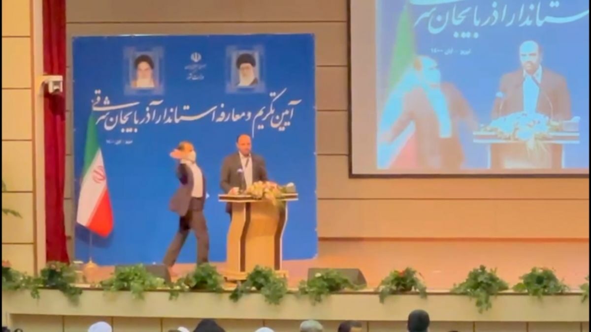 Today at the introduction ceremony for the new governor of #Iran‘s East Azerbaijan Province Abedin Khorram, a man went up to the podium and slapped him in the face. pic.twitter.com/vyEFoBy8WA