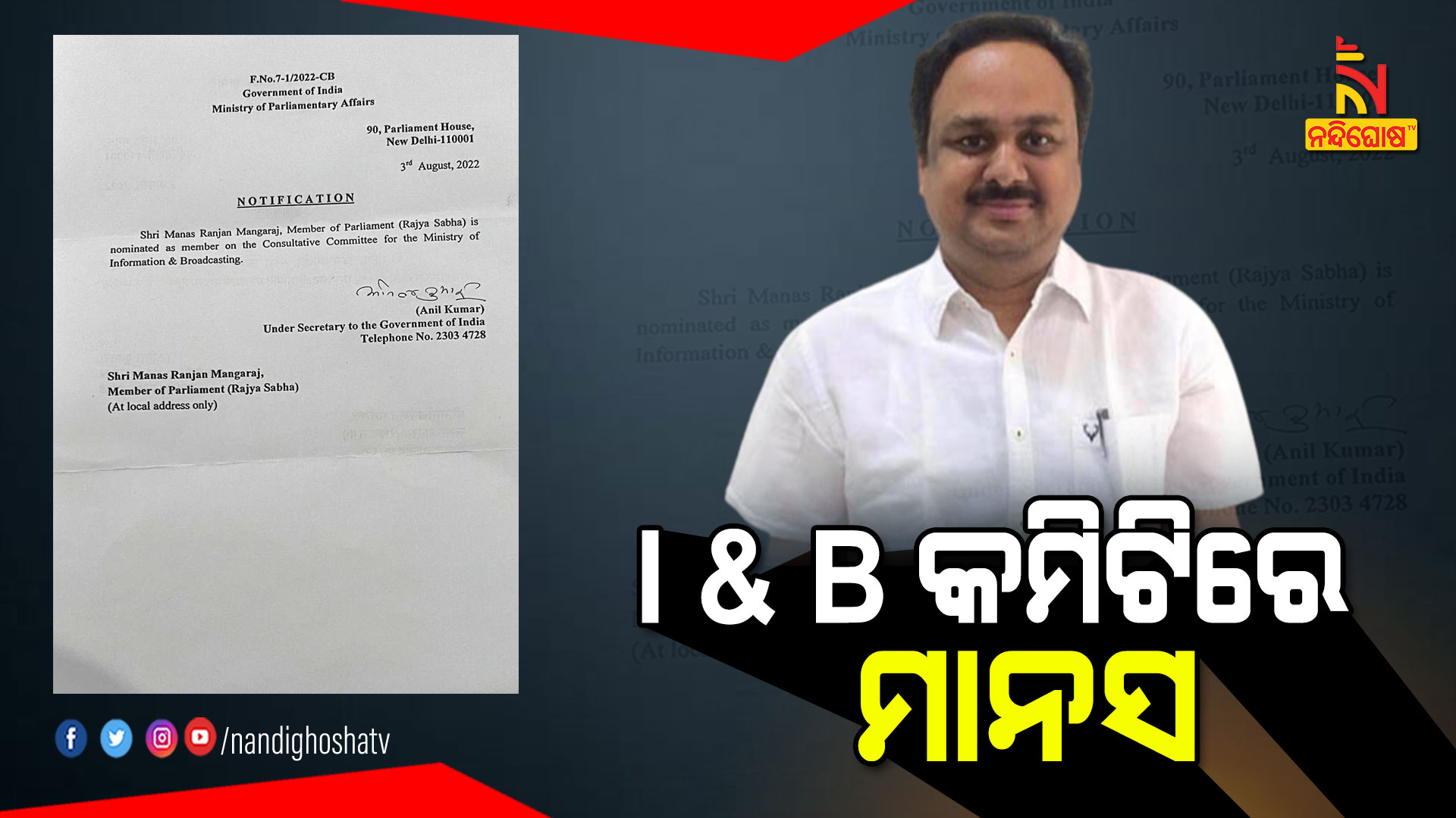 ନୂଆଦିଲ୍ଲୀ: ବିଜେଡି ସାଂସଦ ମାନସ ମଙ୍ଗରାଜଙ୍କୁ ଗୁରୁଦାୟିତ୍ବ । ସୂଚନା ଓ ପ୍ରସାରଣ ମନ୍ତ୍ରାଳୟର ପରାମର୍ଶଦାତା କମିଟିର ସଦସ୍ୟ ଭାବେ ମନୋନୀତ ହେଲେ ମାନସ । ସଂସଦୀୟ ବ୍ୟାପାର ମନ୍ତ୍ରାଳୟ ପକ୍ଷରୁ ଏ ନେଇ ବିଜ୍ଞପ୍ତି ପ୍ରକାଶ କରାଯାଇଛି ।