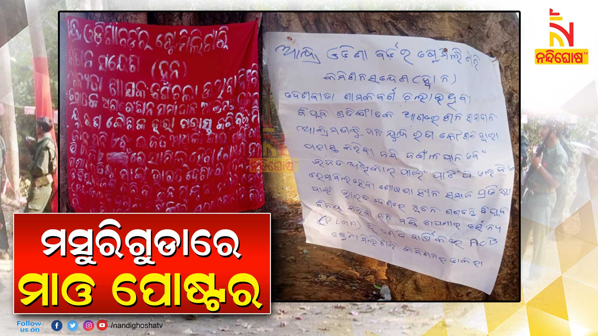 ମାଲକାନଗିରି: ସ୍ୱାଭିମାନ ଅଞ୍ଚଳରେ ପୁଣି ଲାଗିଲା ମାଓ ପୋଷ୍ଟର । ମସୁରିଗୁଡା ଗାଁରେ ପୋଷ୍ଟର ମାରିଛି ଲାଲବାହିନୀ । ଆନ୍ଧ୍ର- ଓଡ଼ିଶା ସୀମାରେ ଷ୍ଟେଟ ମିଲିଟାରୀ ସଂଗଠନ ପକ୍ଷରୁ ଏହି ପୋଷ୍ଟର ଲଗାଯାଇଥିବା ଜମାପଡିଛି ।