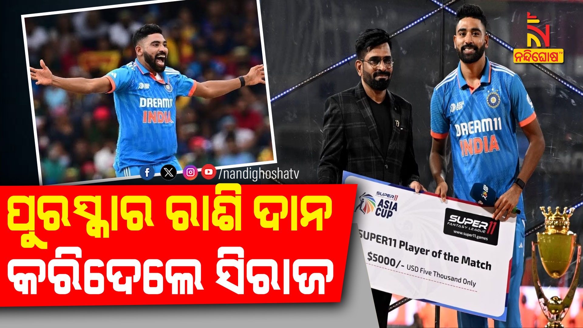 ତେବେ ସେ ଏହି ପୁରସ୍କାର ରାଶି ପ୍ରଦାନ କରି କେବଳ ଦେଶରେ ନୁହେଁ ବରଂ ସାରା ବିଶ୍ୱରେ ପ୍ରଶଂସାର ପାତ୍ର ହୋଇଛନ୍ତି । ତାଙ୍କର ଏହି ମହାନତା ପାଇଁ ସବୁଆଡ଼ୁ ଶୁଭେଚ୍ଛା ଜଣାଯାଇଛି । ଆଜି କଲମ୍ବୋର ପ୍ରେମଦାସା ଷ୍ଟାଡିୟମରେ ଖେଳାଯାଇଥିବା ଫାଇନାଲ ମ୍ୟାଚରେ ସିରାଜ ସର୍ବାଧିକ ୬ଟି ୱିକେଟ୍ ଅକ୍ତିଆର କରିଥିଲେ । ପ୍ରଥମେ ବ୍ୟାଟିଂ କରି ଶ୍ରୀଲଙ୍କା ମାତ୍ର ୫୦ ରନରେ ଅଲଆଉଟ୍ ହୋଇଯାଇଥିଲା । ୬.୨ ଓଭରରେ ଭାରତ ବିନା ୱିକେଟ୍ ହରାଇ ୫୧ ରନର ବିଜୟ ଲକ୍ଷ୍ୟକୁ ହାସଲ କରିନେଇଥିଲା । ଏଥିସହିତ ଭାରତ ଅଷ୍ଟମ ଥର ପାଇଁ ଏସିଆ କପ୍ ଚାମ୍ପିଅନ୍ ହୋଇଛି ।