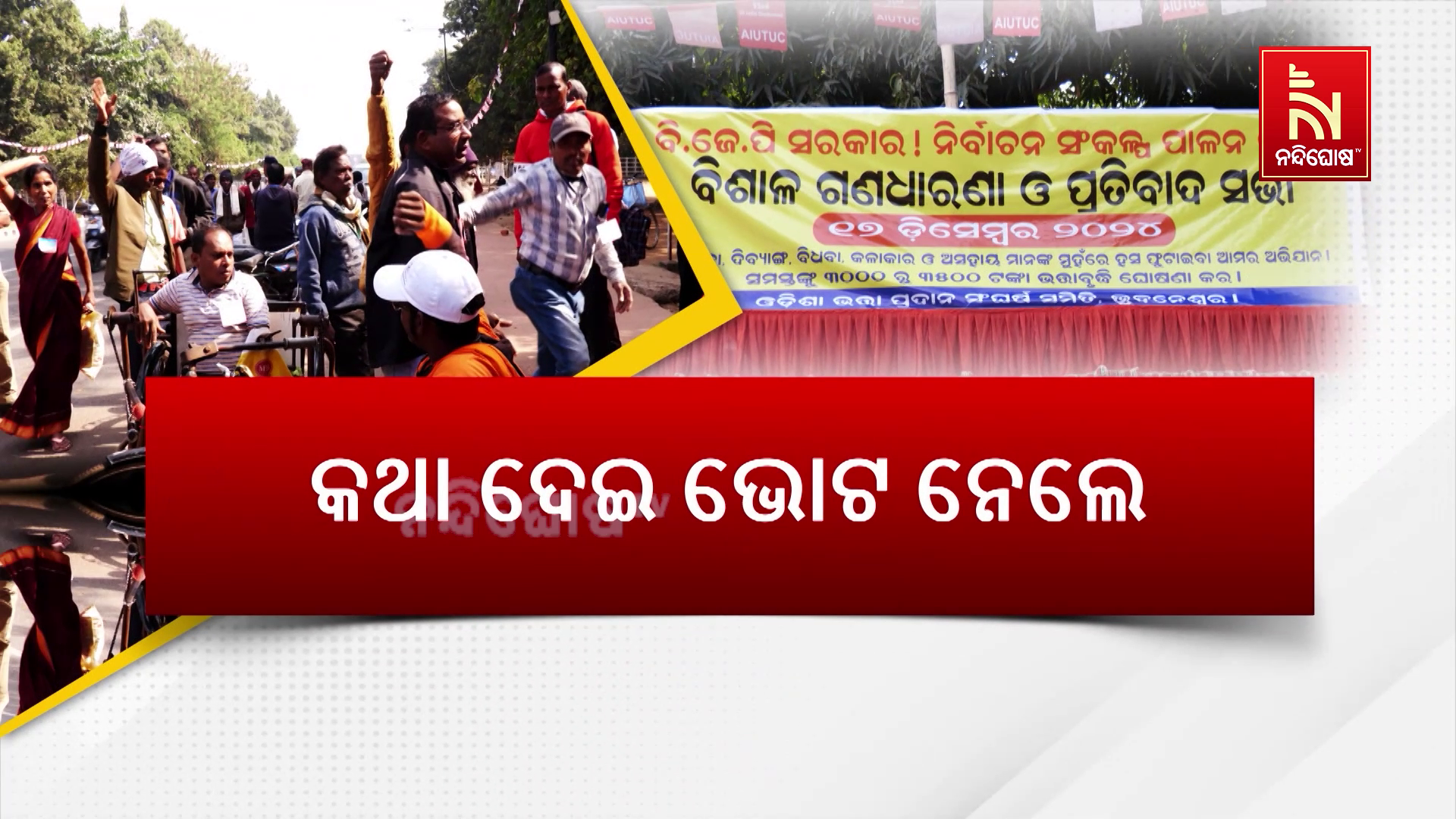 କଥା ଦେଇ ଭୋଟ ନେଲେ। ଭୋଟ ପାଇବା ପରେ ନିଜ କଥାକୁ ନିଜେ ଭୁଲିଗଲେ। ଏପରି ସ୍ଲୋଗାନ ଦେଇ ବିଧାନସଭା ଆଗରେ ଧାରଣାରେ ବସିଛନ୍ତି ବୃଦ୍ଧ, ବୃଦ୍ଧା, ବିଧବା, ଦିବ୍ୟାଙ୍ଗ, ଦୁଃସ୍ଥ କଳାକାର ଓ ଅସହାୟ ମହିଳା ଭତ୍ତା ହିତାଧିକାରୀ। ମୋହନ ସରକାରଙ୍କୁ ପ୍ରଶ୍ନ, କେବେ ମିଳିବ ୩୫୦୦ ଟଙ୍କା ଭତ୍ତା ? ସରକାର ଗଠନର ୬ ମାସ ପରେ ବି କାହିଁକି ନିଜ ପ୍ରତିଶୃତି ପୂରଣ କରୁନି ବିଜେପି ସରକାର ? ନିର୍ବାଚନ ବେଳେ ଅନେକ ବଡ଼ ବଡ଼ ପ୍ରତିଶୃତି ଦେଇଥିଲା ବିଜେପି। ବାର୍ଦ୍ଧକ୍ୟ ଭତ୍ତା, ବିଧବା ଭତ୍ତା, ଭିନ୍ନକ୍ଷମ ଭତ୍ତାକୁ ବୃଦ୍ଧି କରି ୩୦୦୦ ଟଙ୍କା କରାଯିବ ବୋଲି ଓଡ଼ିଶାବାସୀଙ୍କୁ ଗ୍ୟାରେଣ୍ଟି ଦେଇଥିଲା ଭାରତୀୟ ଜନତା ପାର୍ଟି।