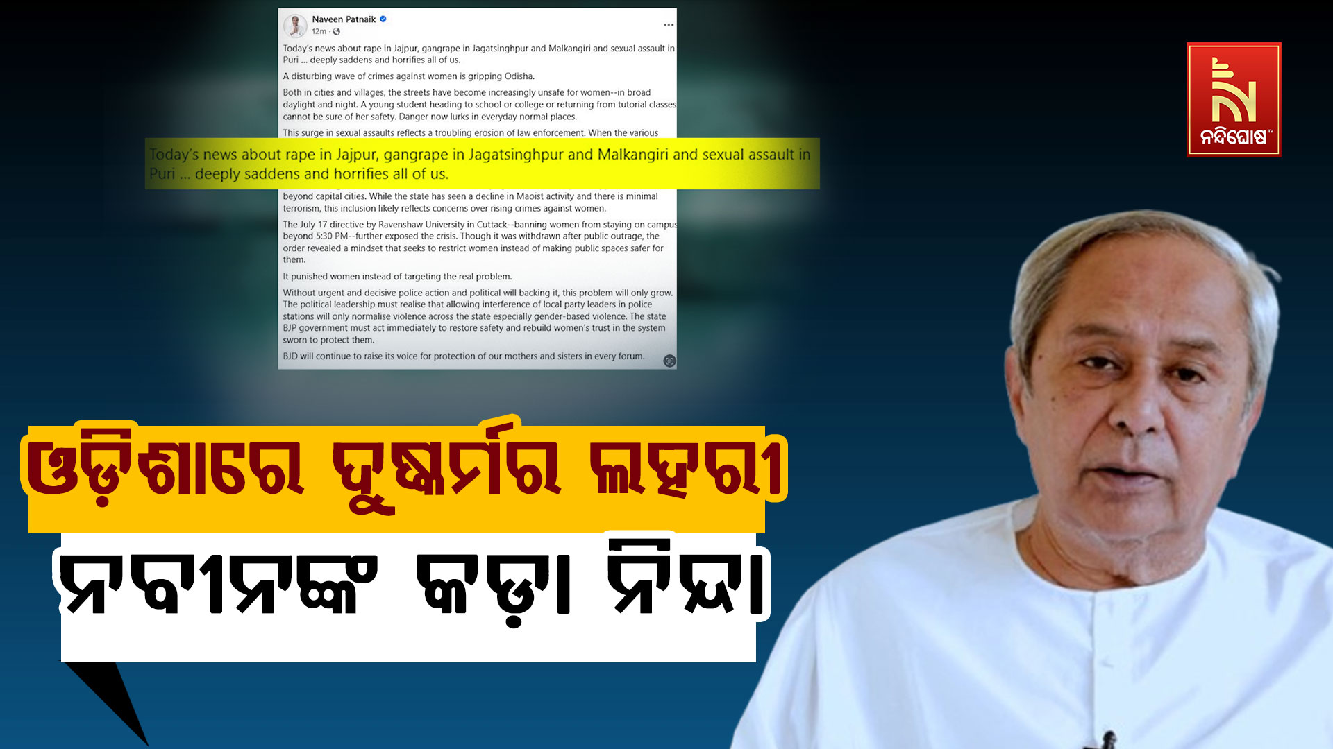ଭୁବନେଶ୍ବର: ଓଡ଼ିଶାରେ ଏବେ ଦୁଷ୍କର୍ମର ଲହରୀ ଚାଲିଛି । ଯାହାକୁ ଦେଖିଲେ ଶୁଣିଲେ ଅତ୍ୟନ୍ତ ବିଚଳିତ ଲାଗୁଛି । ଗୋଟିଏ ଦିନରେ ଯାଜପୁର, ଜଗତସିଂହପୁର ଗଣଦୁଷ୍କର୍ମ, ମାଲକାନଗିରି ଓ ପୁରୀରେ ଝିଅ ଅସଦାଚରଣ ଦେଖି ଏପରି କ୍ଷୋଭ ପ୍ରକାଶ କରି ସୋସିଆଲ ମିଡିଆ ଏକସ୍ରେ ପୋଷ୍ଟ କରିଛନ୍ତି ବିରୋଧୀ ଦଳ ନେତା ତଥା ପୂର୍ବତନ ମୁଖ୍ୟମନ୍ତ୍ରୀ ନବୀନ ପଟ୍ଟନାୟକ । ସହରଠୁ ଗାଁ ସବୁଠି ମହିଳାଙ୍କ ପାଇଁ ଅସୁରିକ୍ଷତ ହୋଇପଡ଼ିଛି । ଦିନ ଦ୍ବିପହର ହେଉ କି ରାତି ଜଣେ ଯୁବତୀ ଘରୁ ବାହାରିବାକୁ ନିଜକୁ ସୁରକ୍ଷିତ ମଣୁନାହାନ୍ତି । ଜଣେ ଛାତ୍ରୀ ସ୍କୁଲ, କଲେଜ୍ କିମ୍ବା ଟ୍ୟୁସନ ଗଲେ ଘରକୁ ଭଲରେ ଫେରିବ ଏ ଗ୍ୟାରେଣ୍ଟି ଆଉ ନାହିଁ । ପାଦେ ପାଦେ ଏବେ ବିପଦ । ଏହା ପ୍ରମାଣିତ କରୁଛି ରାଜ୍ୟରେ ଆଇନଶୃଙ୍ଖଳା କିଛି ବି ନାହିଁ । ଯେତେବେଳେ ପୋଲିସ ରାଜନୈତିକ ଚାପ ଓ ହସ୍ତକ୍ଷେପ ଯୋଗୁ ପ୍ରଭାବିତ ହେଉଛି ସେଠି ମହିଳା ଓ ଝିଅଙ୍କ ଜୀବନ ଦୁର୍ବିସହ ହେବାରେ ଲାଗିଛି । ଯେଉଁଥିପାଇଁ ଗତମାସରେ ଆମେରିକା ସରକାର ଲେଭଲ-୨ ଭ୍ରମଣ ସତର୍କତା ଜାରି କଲେ । ଯେଉଁଥିରେ ଜଗନ୍ନାଥଙ୍କ ମାଟି ଓଡ଼ିଶା ସାମିଲ ରହିଛି ।