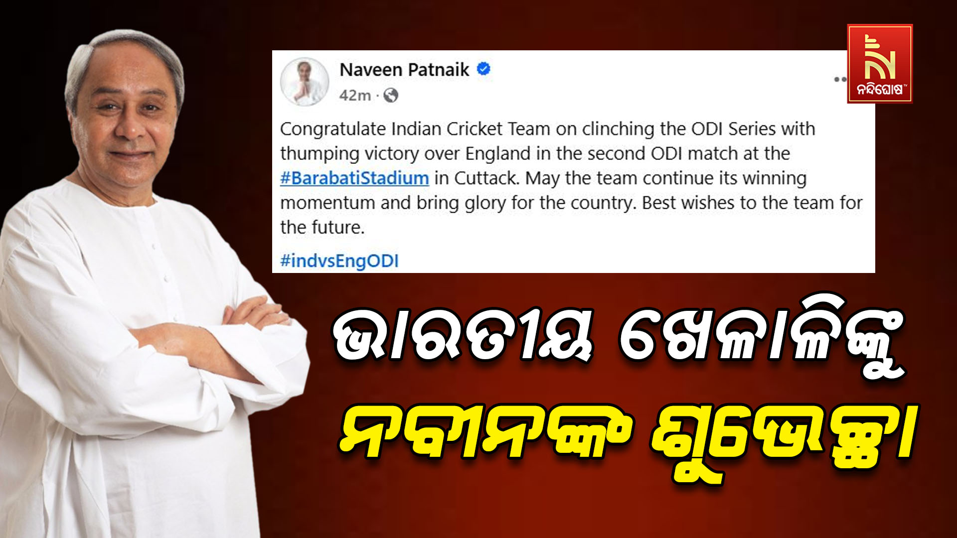 ଭୁବନେଶ୍ବର : ଦ୍ବିତୀୟ ଦିନିକିଆରେ ଭାରତର ଦମଦାର ବିଜୟ । ଇଂଲଣ୍ଡକୁ ୪ ୱିକେଟରେ ହରାଇ ସିରିଜ କବଜା କଲା ଟିମ୍ ଇଣ୍ଡିଆ । ଭାରତୀୟ ଖେଳାଳିଙ୍କୁ ଶୁଭେଚ୍ଛା ଜଣାଇଲେ ବିରୋଧୀ ଦଳ ନେତା ନବୀନ ପଟ୍ଟନାୟକ । ଭାରତୀୟ ଦଳ ବିଜୟର ଗତି ଜାରି ରଖିବା ସହ ଦେଶ ପାଇଁ ଗୌରବ ଆଣନ୍ତୁ ବୋଲି କହିଛନ୍ତି ନବୀନ । ଏହାର ସହ ଆଗାମୀ ମ୍ୟାଚ ପାଇଁ ମଧ୍ୟ ଶୁଭକାମନା ଜଣାଇଛନ୍ତି ।