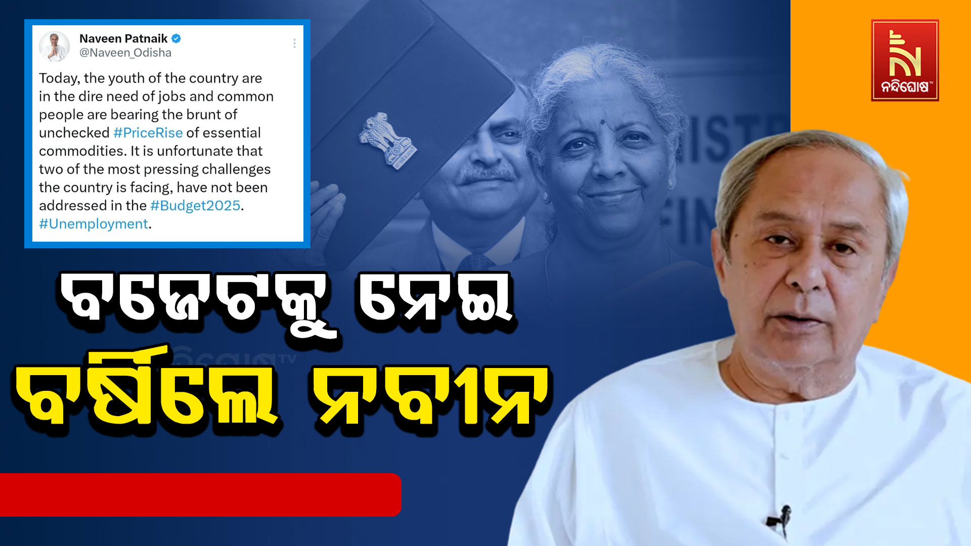 ନନ୍ଦିଘୋଷ ବ୍ୟୁରୋ: ପୁଣି ଥରେ କେନ୍ଦ୍ର ବଜେଟରେ ଓଡ଼ିଶା ନିରାଶ। ବଜେଟରେ ଅନ୍ୟ ରାଜ୍ୟକୁ ସ୍ଵତନ୍ତ୍ର ଅନୁଦାନ ମିଳିଥିବା ବେଳେ ଏଥର ବି ଓଡ଼ିଶାକୁ ଅଣଦେଖା କରିଛନ୍ତି କେନ୍ଦ୍ର ସରକାର। ଓଡ଼ିଶାର ସ୍ଵତନ୍ତ୍ର ରାଜ୍ୟ ପାହ୍ୟା ମାନ୍ୟତାର ନ୍ୟାଯ୍ୟ ଦାବିକୁ ଏଡ଼ାଇ ଯାଇଛନ୍ତି କେନ୍ଦ୍ର ସରକାର। ଓଡ଼ିଶା ବାରମ୍ଵାର ପ୍ରାକୃତିକ ବିପର୍ଯ୍ୟୟରେ ଘାଣ୍ଟି ହେଉଥିବା ବେଳେ କେନ୍ଦ୍ର ଏଥିପ୍ରତି ବଜେଟରେ ଦୃଷ୍ଟି ଦେଇ ନାହାନ୍ତି ବୋଲି କଡ଼ା ସମାଲୋଚନା କରିଛନ୍ତି ବିଜେଡି ସୁପ୍ରିମୋ ନବୀନ ପଟ୍ଟନାୟକ। ସୋସିଆଲ ମିଡିଆରେ ଏକ୍ସରେ ନବୀନ ଉଲ୍ଲେଖ କରିଛନ୍ତି, ଦେଶର ଯୁବକଙ୍କୁ ଏବେ ନିଯୁକ୍ତି ଦରକାର। ସେହିପରି ସାଧାରଣ ଲୋକେ ଦରଦାମ ବୃଦ୍ଧିରେ ଘାଣ୍ଟି ହେଉଥିବା ବେଳେ ଦୁର୍ଭାଗ୍ୟ ଯେ ଏହି ଦୁଇଟି ଚ୍ୟାଲେଞ୍ଜକୁ ବଜେଟରେ ଆଦୌ ଦୃଷ୍ଟି ଦିଆଯାଇନାହିଁ ବୋଲି ନବୀନ ପଟ୍ଟନାୟକ କଡ଼ା ସମାଲୋଚନା କରିଛନ୍ତି।