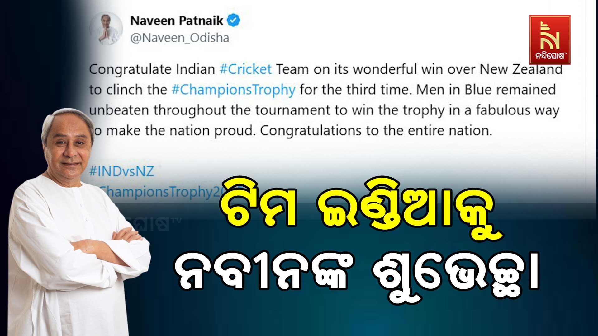 ନନ୍ଦିଘୋଷ ବ୍ୟୁରୋ: ଚାମ୍ପିଅନ୍ସ ଟ୍ରଫିରେ ବିଜୟ ପରେ ଟିମ ଇଣ୍ଡିଆକୁ ଶୁଭେଚ୍ଛା ଜଣାଇଛନ୍ତି ବିଜେଡି ସୁପ୍ରିମୋ ତଥା ପୂର୍ବତନ ମୁଖ୍ୟମନ୍ତ୍ରୀ ନବୀନ ପଟ୍ଟନାୟକ। ନ୍ୟୁଜିଲାଣ୍ଡକୁ ହରାଇ ତୃତୀୟ ଥର ଲାଗି ଚାମ୍ପିଅନ୍ସ ଟ୍ରଫି ହାତେଇବା ମୁହୂର୍ତ୍ତ ଆଶ୍ଚର୍ଯ୍ୟଜନକ ବିଜୟ। ମେନ ଇନ ବ୍ଲୁ ପୁରା ଟୁର୍ଣ୍ଣାମେଣ୍ଟରେ ଅପରାଜେୟ ରହି ଟ୍ରଫି ହାତେଇଛି। ଟିମ ଇଣ୍ଡିଆର ଏହି ବିଜୟରେ ସାରା ଦେଶ ଗର୍ବିତ ବୋଲି କହିଛନ୍ତି। ଟିମ ଇଣ୍ଡିଆର ଏହି ବିଜୟ ଲାଗି ସାରା ଦେଶବାସୀଙ୍କୁ ଶୁଭେଚ୍ଛା ଜଣାଇଛନ୍ତି ବିଜେଡି ସୁପ୍ରିମୋ ନବୀନ ପଟ୍ଟନାୟକ ।