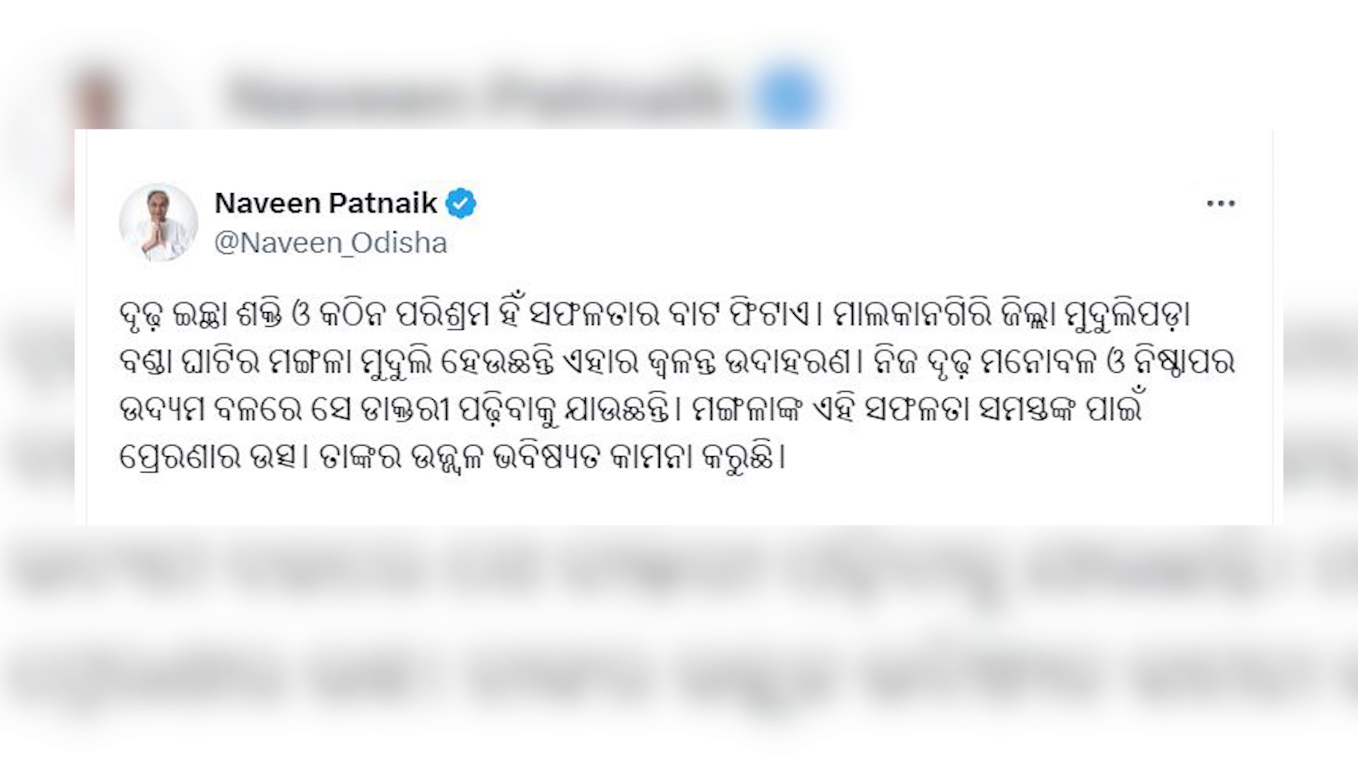 ନନ୍ଦିଘୋଷ ବ୍ୟୁରୋ: ମାଲକାନଗିରି ବଣ୍ଡାଘାଟିର ପ୍ରଥମ ଆଦିବାସୀ ଛାତ୍ର ମଙ୍ଗଳା ମୁଦୁଲି MBBS ପାଠ୍ୟକ୍ରମରେ ନାମ ଲେଖାଇଥିବାରୁ ଅଭିନନ୍ଦନ ଜଣାଇଛନ୍ତି ବିଜେଡି ସୁପ୍ରିମୋ ତଥା ପୂର୍ବତନ ମୁଖ୍ୟମନ୍ତ୍ରୀ ନବୀନ ପଟ୍ଟନାୟକ। ଦୃଢ ଇଚ୍ଛାଶକ୍ତି ଓ କଠିନ ପରିଶ୍ରମ ହିଁ ସଫଳତାର ବାଟ ଫିଟାଏ ବୋଲି କହିଛନ୍ତି ନବୀନ। ମାଲକାନଗିରି ଜିଲ୍ଲା ବଣ୍ଡାଘାଟିର ମଙ୍ଗଳା ମୁଦୁଲି ହେଉଛନ୍ତି ଏହାର ଜ୍ଵଳନ୍ତ ଉଦାହରଣ। ନଜ ଦୃଢ ମନୋବଳ ଓ ନିଷ୍ଠାପର ଉଦ୍ୟମବଳରେ ସେ ଡାକ୍ତରୀ ପଢିବାକୁ ଯାଉଛନ୍ତି। ମଙ୍ଗଳାଙ୍କ ଏହି ସଫଳତା ସମସ୍ତଙ୍କ ପାଇଁ ପ୍ରେରଣାର ଉତ୍ସବ। ତାଙ୍କର ଉଜ୍ଜଳ ଭବିଷ୍ୟତ କାମନା କରୁଛି ବୋଲି କହିଛନ୍ତି ବିଜେଡି ସୁପ୍ରିମୋ ତଥା ପୂର୍ବତନ ମୁଖ୍ୟମନ୍ତ୍ରୀ ନବୀନ ପଟ୍ଟନାୟକ।