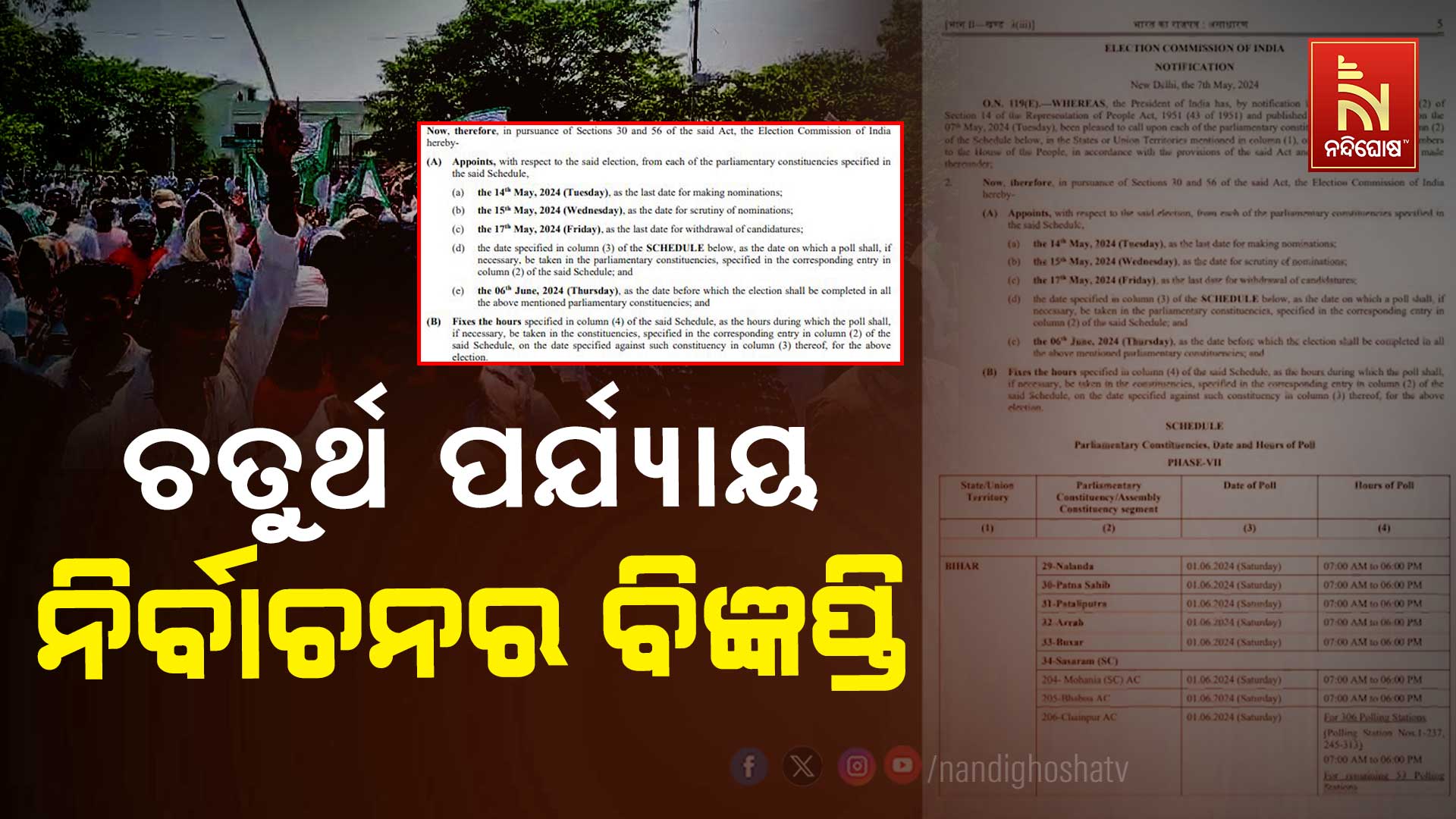 ଭୁବନେଶ୍ୱର : ଓଡ଼ିଶାରେ ଚତୁର୍ଥ ପର୍ଯ୍ୟାୟ ନିର୍ବାଚନ ପାଇଁ ପ୍ରକାଶ ପାଇଲା ବିଜ୍ଞପ୍ତି। ରାଜ୍ୟରେ ଚତୁର୍ଥ ତଥା ଶେଷ ପର୍ଯ୍ୟାୟ ନିର୍ବାଚନ ପାଇଁ ପ୍ରକାଶ ପାଇଛି ବିଧିବଦ୍ଧ ବିଜ୍ଞପ୍ତି। ରାଜ୍ୟର ୬ ଲୋକସଭା ଆସନ ମୟୂରଭଞ୍ଜ, ବାଲେଶ୍ବର, ଭଦ୍ରକ, ଯାଜପୁର, କେନ୍ଦ୍ରାପଡ଼ା ଓ ଜଗତସିଂହପୁରରେ ଭୋଟ୍ ଗ୍ରହଣ ହେବ।