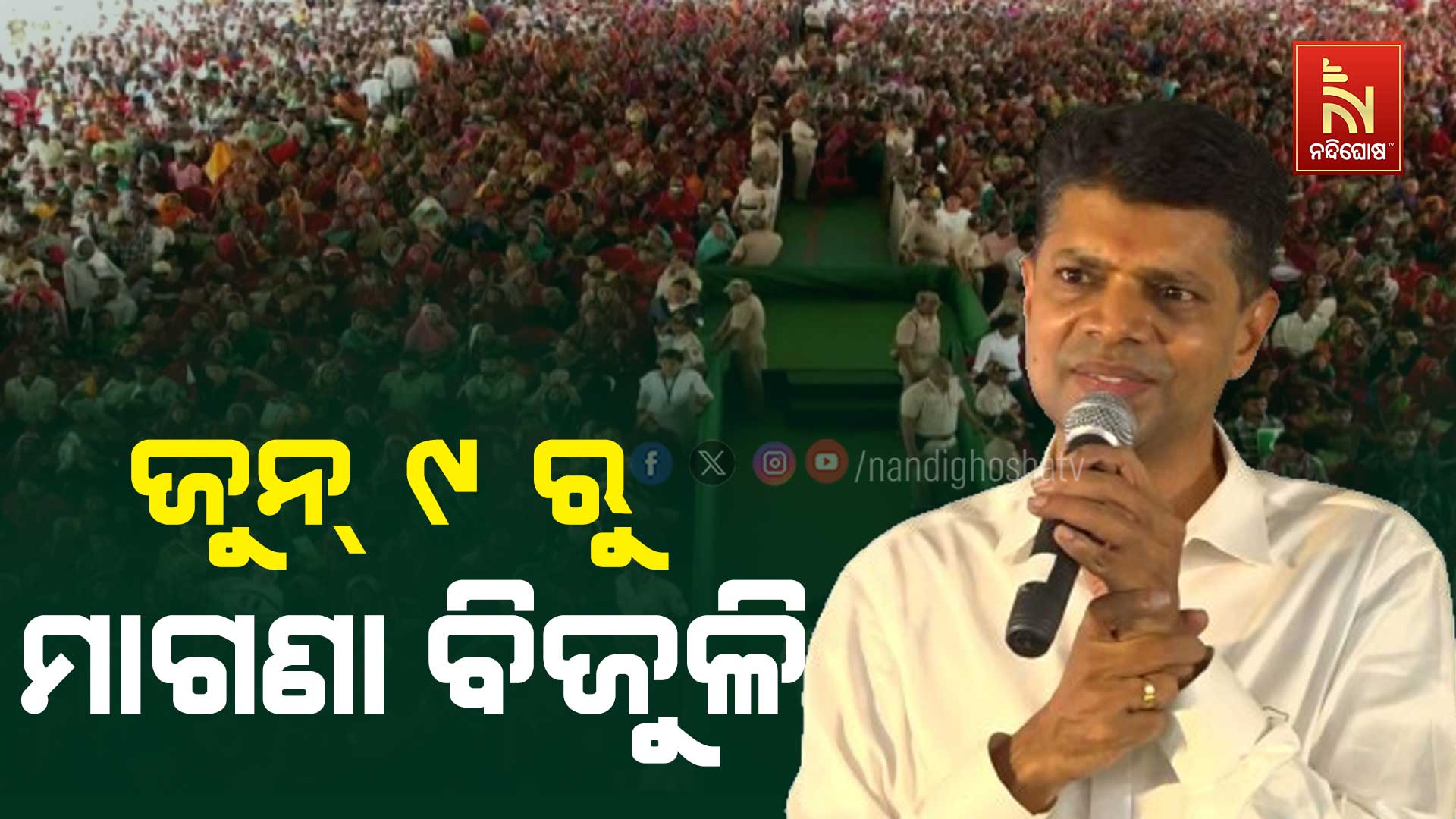 ଜୁନ ୯ ତାରିଖରେ ମୁଖ୍ୟମନ୍ତ୍ରୀ ଭାବେ ଶପଥ ନେବେ ନବୀନ ପଟ୍ଟନାୟକ। ଜୁନ ୯ ତାରିଖ ସଂଧ୍ୟାବେଳେ ମନ୍ତ୍ରିମଣ୍ଡଳରେ ଏହି ଇସ୍ତାହାରକୁ ସ୍ଵୀକୃତି ଦେବେ ମୁଖ୍ୟମନ୍ତ୍ରୀ। ରାଜ୍ୟବାସୀଙ୍କୁ ମାଗଣା ବିଜୁଳି ପ୍ରଦାନ ନେଇ ଏହି ବଡ଼ ଘୋଷଣା କରିଛନ୍ତି 5T ଅଧ୍ୟକ୍ଷ କାର୍ତ୍ତିକ ପାଣ୍ଡିଆନ। ଏଇଟା ନବୀନ ବାବୁଙ୍କର ଗ୍ୟାରେଣ୍ଟି ବୋଲି ରଘୁନାଥପାଲ୍ଲୀ ସାଧାରଣ ସଭାରେ ଘୋଷଣା କରିଛନ୍ତି 5T ଅଧ୍ୟକ୍ଷ କାର୍ତ୍ତିକ ପାଣ୍ଡିଆନ।